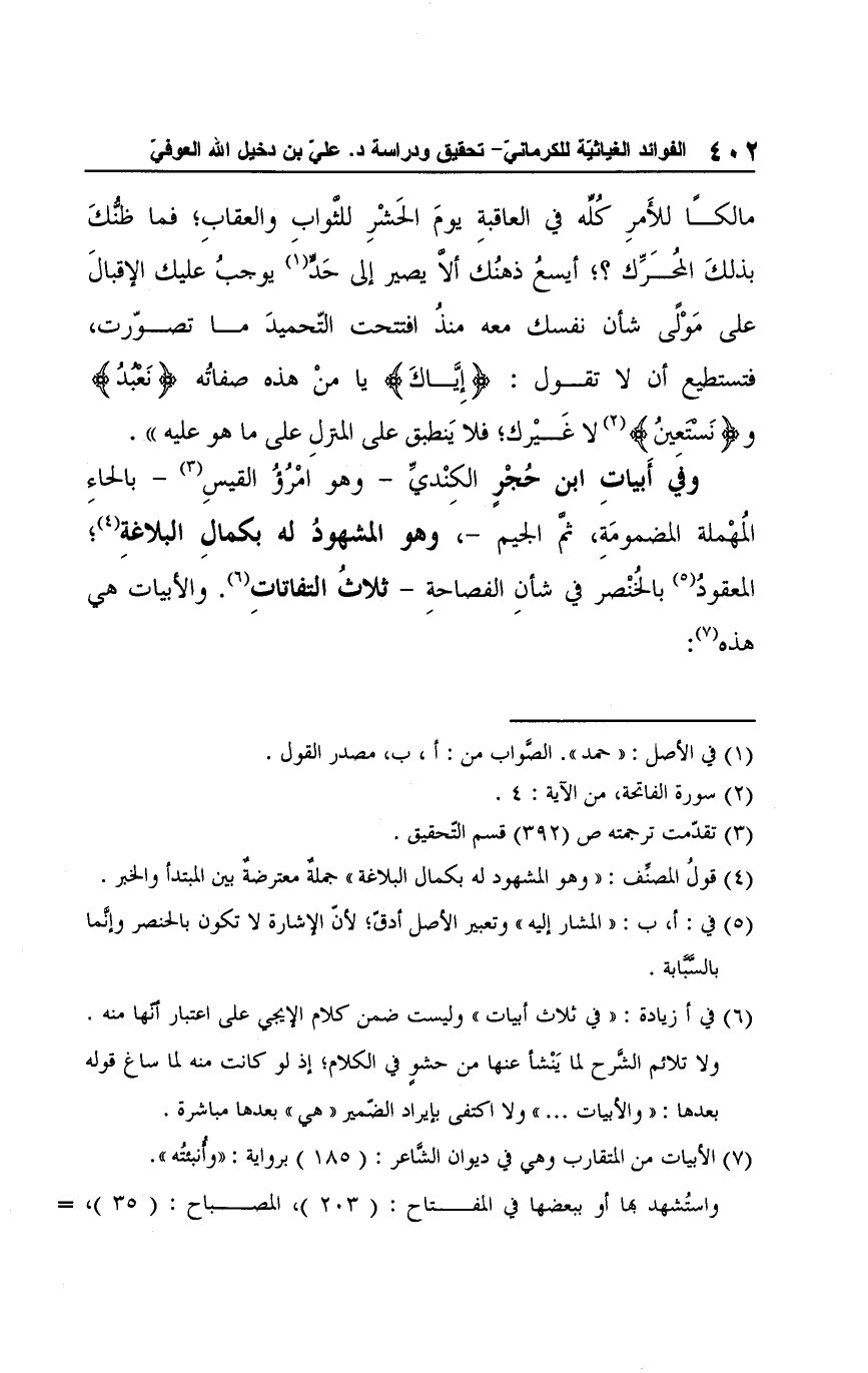 مالكًا للأَمرِ كُلِّه في العاقبةِ يومَ الحَشْرِ للثَّوابِ والعقابِ؛ فما ظنُّكَ بذلكَ المحرِّك؟؛ أيسعُ ذهنُك ألَّا يصير إلى حَدٍّ (1) يوجبُ عليك الإقبال على مَوْلًى شأن نفسك معه منذُ افتتحت التّحميدَ ما تصوّرت، فتستطع أن لا تقول: {إِيَّاكَ} يا منْ هذه صفاتُه {نَعْبُّدُ} و {نَسْتَعِينُ} (2) لا غَيْرك؛ فلا يَنطق على المنزلِ على ما هو عليه".