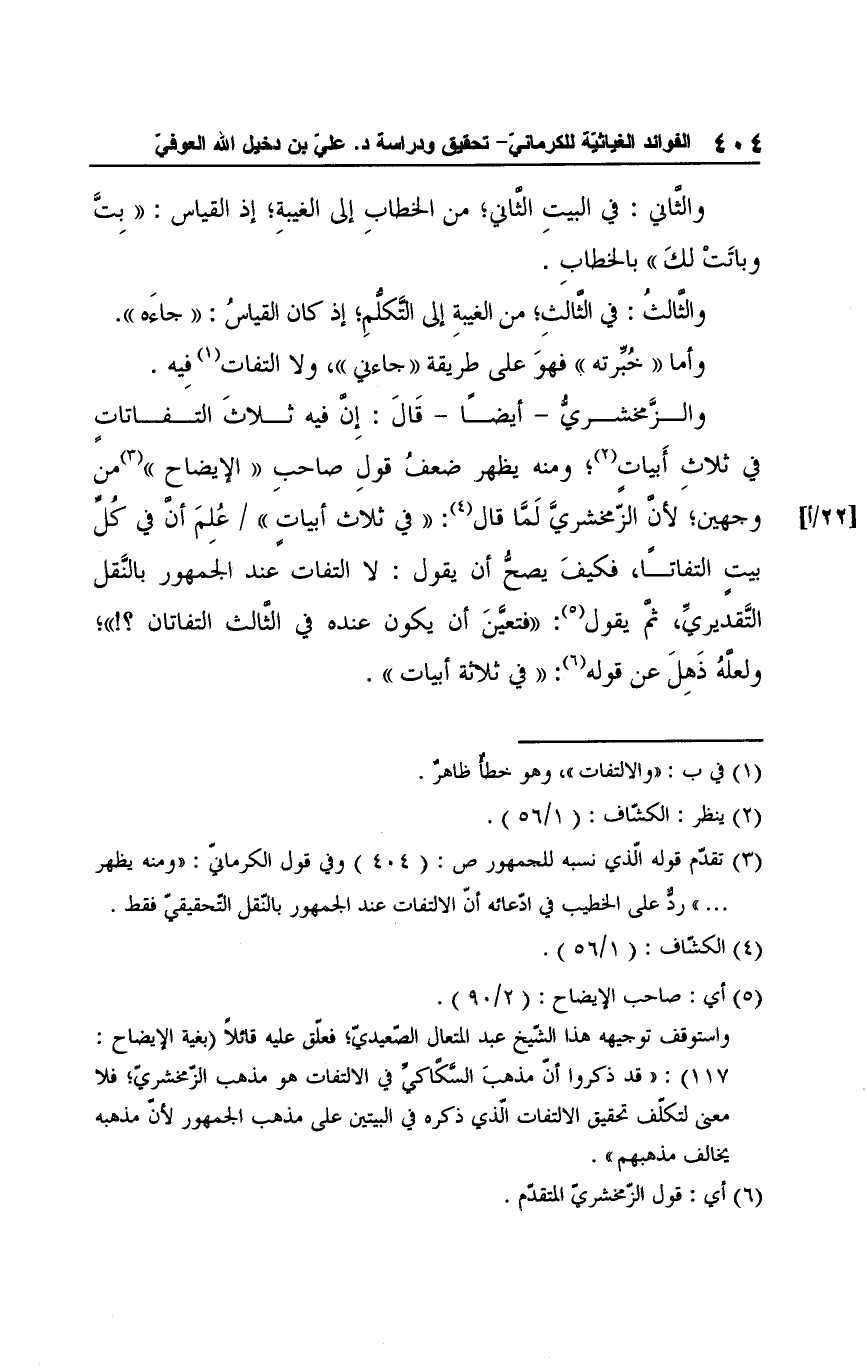 والزَّمخشريُّ -أيضًا- قَال: إِنَّ فيه ثلاثَ التفاتاتٍ في ثلاث أَبياتٍ (¬2)؛ ومنه يظهر ضعفُ قولِ صاحبِ "الإيضاح" (¬3) من وجهين، لأنَّ الزّمخشريَّ لَمَّا قال (¬4): "في ثلاث أبياتٍ" عُلِمَ أنَّ في كُلِّ بيتٍ التفاتًا، فكيفَ يصحُّ أن يقول: لا التفات عند الجمهوو بالنَّقل التَّقديريِّ، ثم يقول (¬5): "فتعيَّنَ أن يكون عنده في الثَّالث التفاتان؟! "؛ ولعلَّهُ ذَهلَ عن قوله (¬6): "في ثلاثة أبيات".