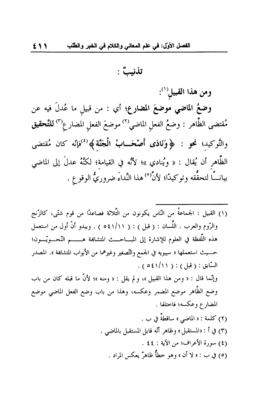 وضعُ الماضي موضعَ المظارع؛ أي: من قبيلِ ما عُدلَ فيه عن مُقتضى الظَّاهر: وضعُ الفعلِ الماضى (¬2) موضعَ الفعلِ المضارع (¬3) للتَّحقيق والتَّوكيدِ؛ نحو: {وَنَادَى أَصْحَابُ الْجَنَّةِ} (¬4) فإنّه كان مُقتضى الظَّاهرِ أن يُقال: "ويُنادى"؛ لأَنَّه في القيامةِ؛ لكنَّهُ عدلَ إلى الماضي بيانًا لتحقُّقه وتوكيدًا؛ لأنَّ (¬5) هذا النِّداءَ ضروريُّ الوقوعِ.
