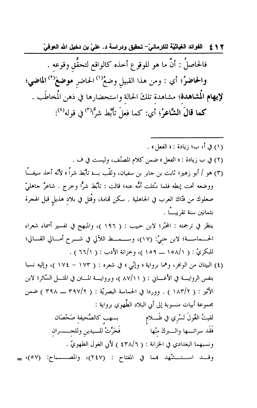 (¬3) هو أبو زهير؛ ثابت بن جابر بن سفيان، ولقّب بـ "تأبّط شرًّا" لأنّه أخذ سيفًا ووضعه تحت إبطه فلما سُئلت أمُّه عنه؛ قالت: تأبّط شرًّا وخرج. شاعرٌ جاهليّ صعلوك من فتّاك العرب في الجاهلية. سكن تهامة، وقُتل في بلادِ هذيلٍ قبل الهجرة بثمانين سنة تقريبًا.