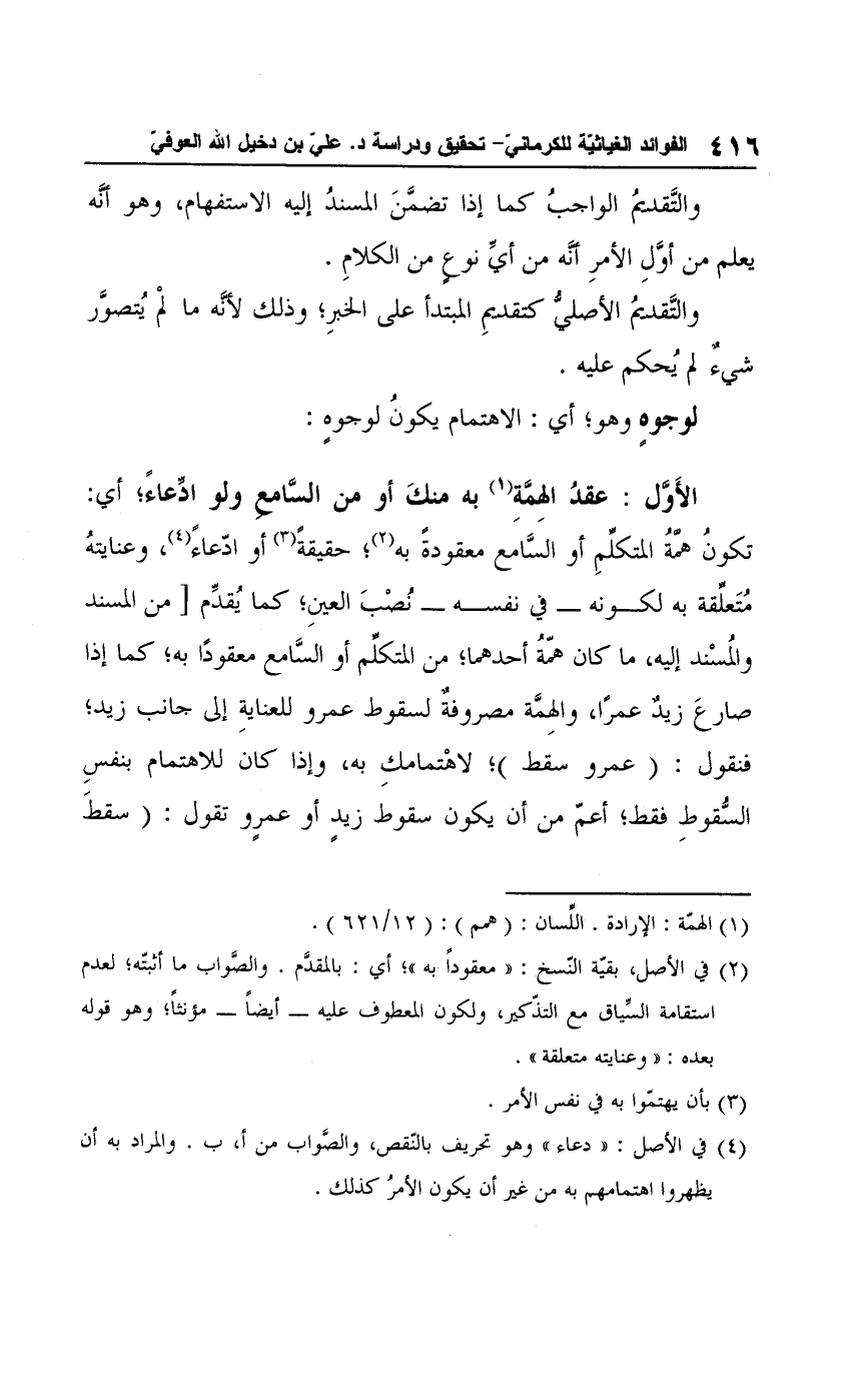 الأَوَّل: عقدُ الهِمَّةِ (¬1) به منكَ أو من السَّامع ولو ادِّعاءً؛ أي: تكونُ همَّةُ المتكلِّمِ أو السَّامع معقودةً به (¬2)؛ حقيقةً (¬3) أو ادّعاءً (¬4)، وعنايتهُ مُتَعلِّقة به لكونه -في نفسه- نُصْبَ العينِ؛ كما يُقدِّم [من المسند والمُسْند إليه، ما كان همّةُ أحدهما؛ من المتكلِّم أو السَّامع معقودًا به؛ كما إذا صارعَ زيدٌ عمرًا، والهِمَّة مصروفةٌ لسقوط عمرو للعنايةِ إلى جانب زيد؛ فنقول: (عمرو سقط)؛ لاهْتمامكِ به، وإذا كان للاهتمام بنفسِ السُّقوطِ فقط؛ أعمّ من أن يكون سقوط زيدٍ أو عمرٍو تقول: (سقطَ