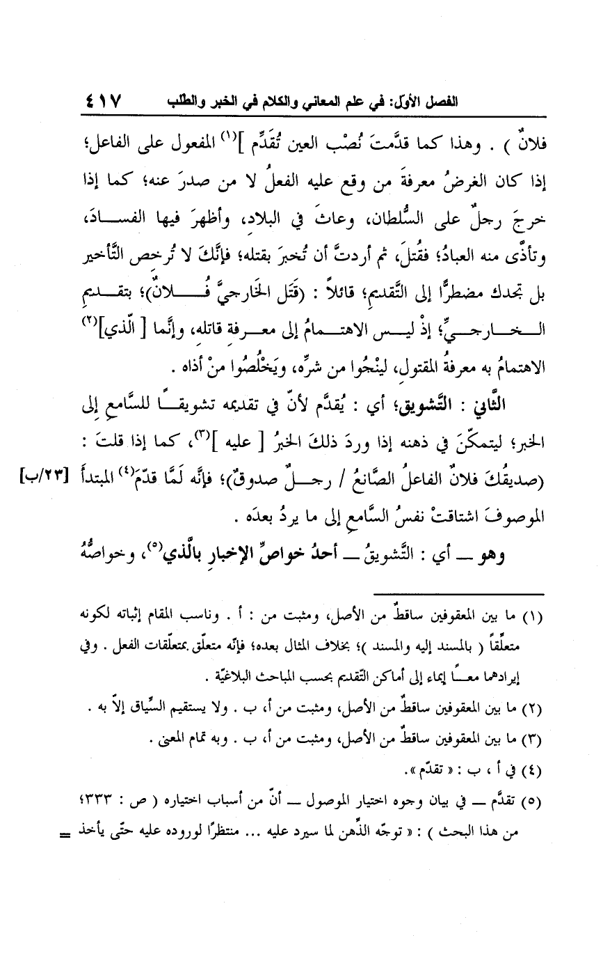 (¬1) ما بين المعقوفين ساقط من الأصل، ومثبت من: أ. وناسب المقام إثباته لكونه متعلِّقًا (بالمسند إليه والمسند)؛ بخلاف المثال بعده؛ فإنّه متعلّق بمتعلّقات الفعل. وفي إيرادهما معًا إيماء إلى أماكن التّقديم بحسب المباحث البلاغيّة.