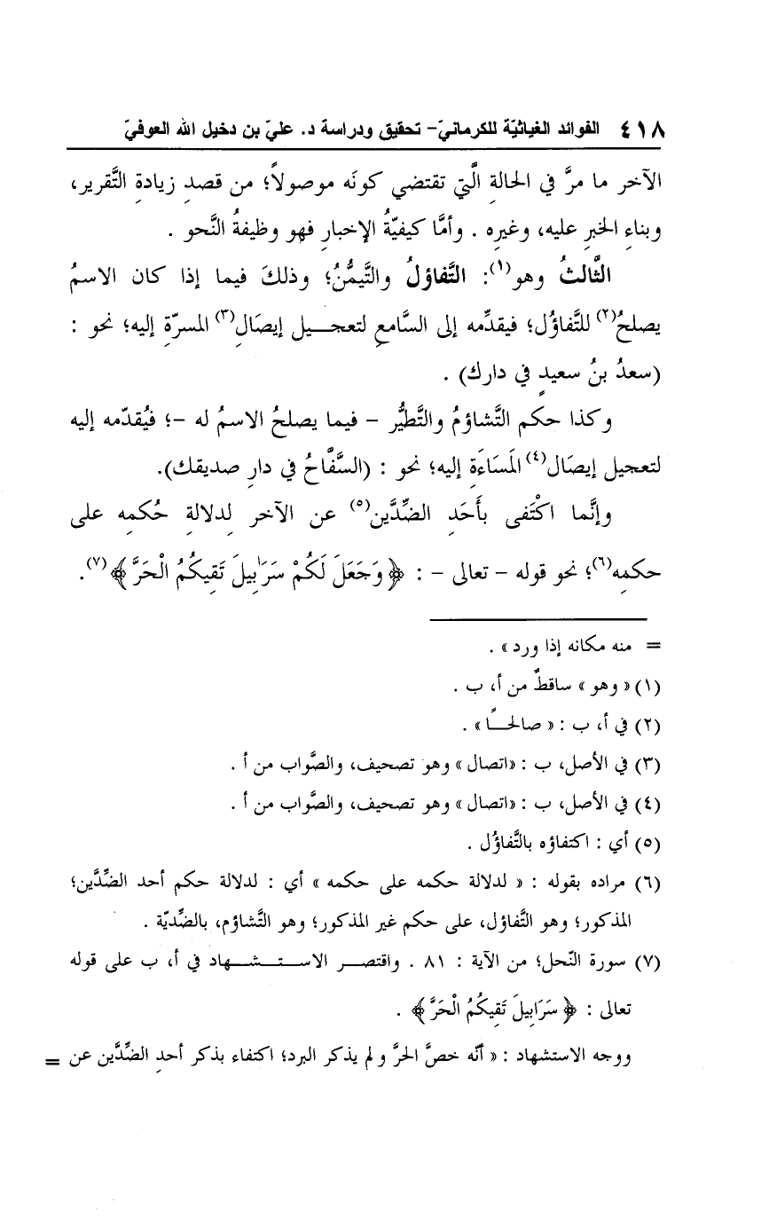 (¬6) مراده بقوله: "لدلالة حكمه على حكمه" أي: لدلالة حكم أحد الضِّدَّين؛ المذكور؛ وهو التَّفاؤل، على حكم غير المذكور؛ وهو التَّشاؤم، بالضِّديّة.