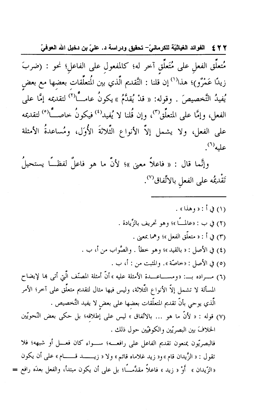 (¬6) مراده بـ: "ومساعدة الأمثلة عليه" أن أمثلة المصنّف الّتي أتى بها لإيضاح المسألة لا تشمل إلّا الأنواع الثَّلاثة، وليس فيها مثال لتقديم متعلِّق على آخر؛ الأمر الَّذي يوحي بأن تقديم المتعلّقات بعضِها على بعضٍ لا يفيد التَّخصيص.