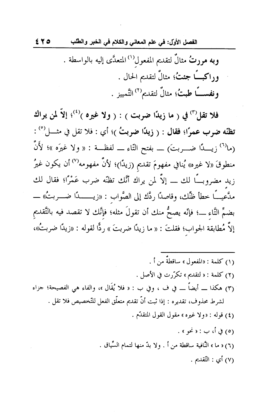 (¬3) هكذا -أيضًا- في ف، وفي ب: "فلا يُقَال"، والفاء هي الفصيحة؛ جزاء لشرط محذوف، تقديره: إذا ثبت أن تقديم متعلّق الفعل للتخصيص فلا تقل.