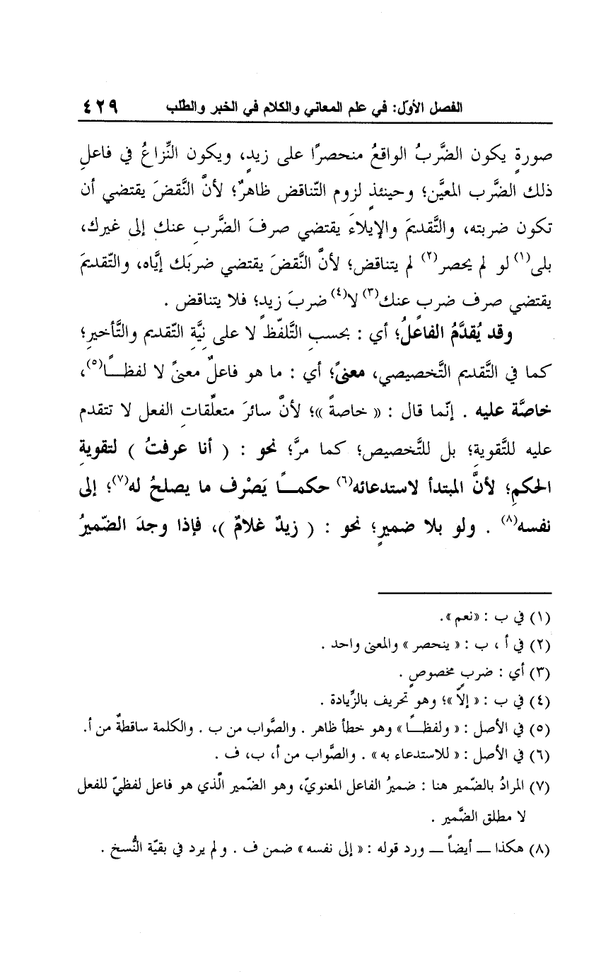 صورةٍ يكون الضَّربُ الواقعُ منحصرًا على زيدٍ، ويكون النِّزاعُ في فاعلِ ذلك الضَّرب المعيَّن؛ وحينئذٍ لزوم التّناقض ظاهرٌ؛ لأنْ النَّقضَ يقتضي أن تكون ضربته، والتَّقديمَ والإيلاءَ يقتضي صرفَ الضَّربِ عنك إلى غيرك، بلى (¬1) لو لم يحصر (¬2) لم يتناقض؛ لأن النَّقضَ يقتضي ضربَك إيَّاه، والتّقديمَ يقتضي صرف ضربٍ عنك (¬3) لا (¬4) ضربَ زيد؛ فلا يتناقض.