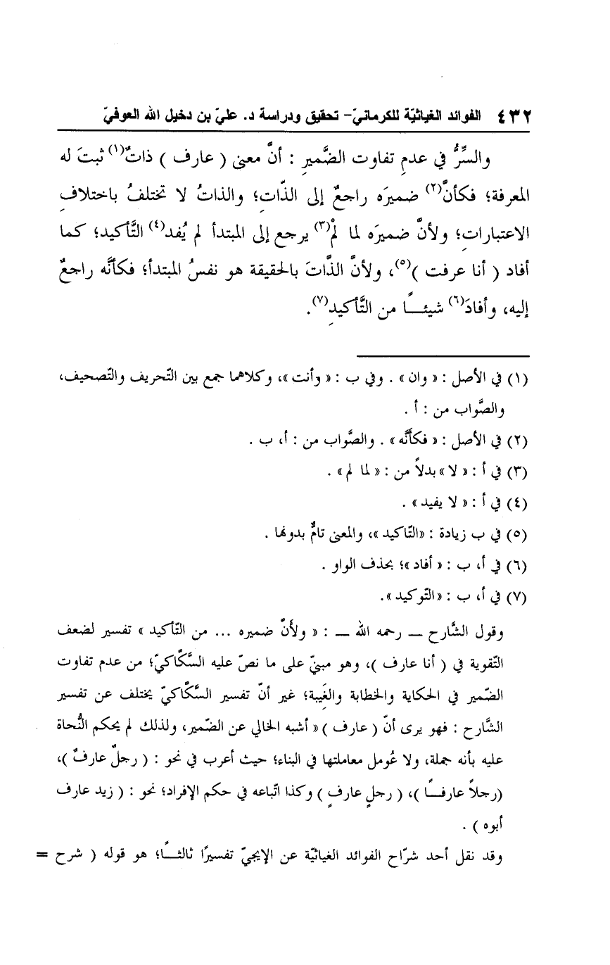 والسِّرُّ في عدمِ تفاوت الضَّميرِ: أنَّ معنى (عارف) ذاتٌ (¬1) ثبتَ له المعرفة، فكأنَّ (¬2) ضميرَه راجعٌ إلى الذّاتِ؛ والذاتُ لا تختلفُ باختلافِ الاعتباراتِ، ولأن ضميرَه لما لمْ (¬3) يرجع إلى المبتدأ لم يُفد (¬4) التَّأكيد؛ كما أفاد (أنا عرفت) (¬5)، ولأنَّ الذَّاتَ بالحقيقة هو نفسُ المبتدأ؛ فكأنَّه راجعٌ إليه، وأفادَ (¬6) شيئًا من التَّأكيدِ (¬7).
