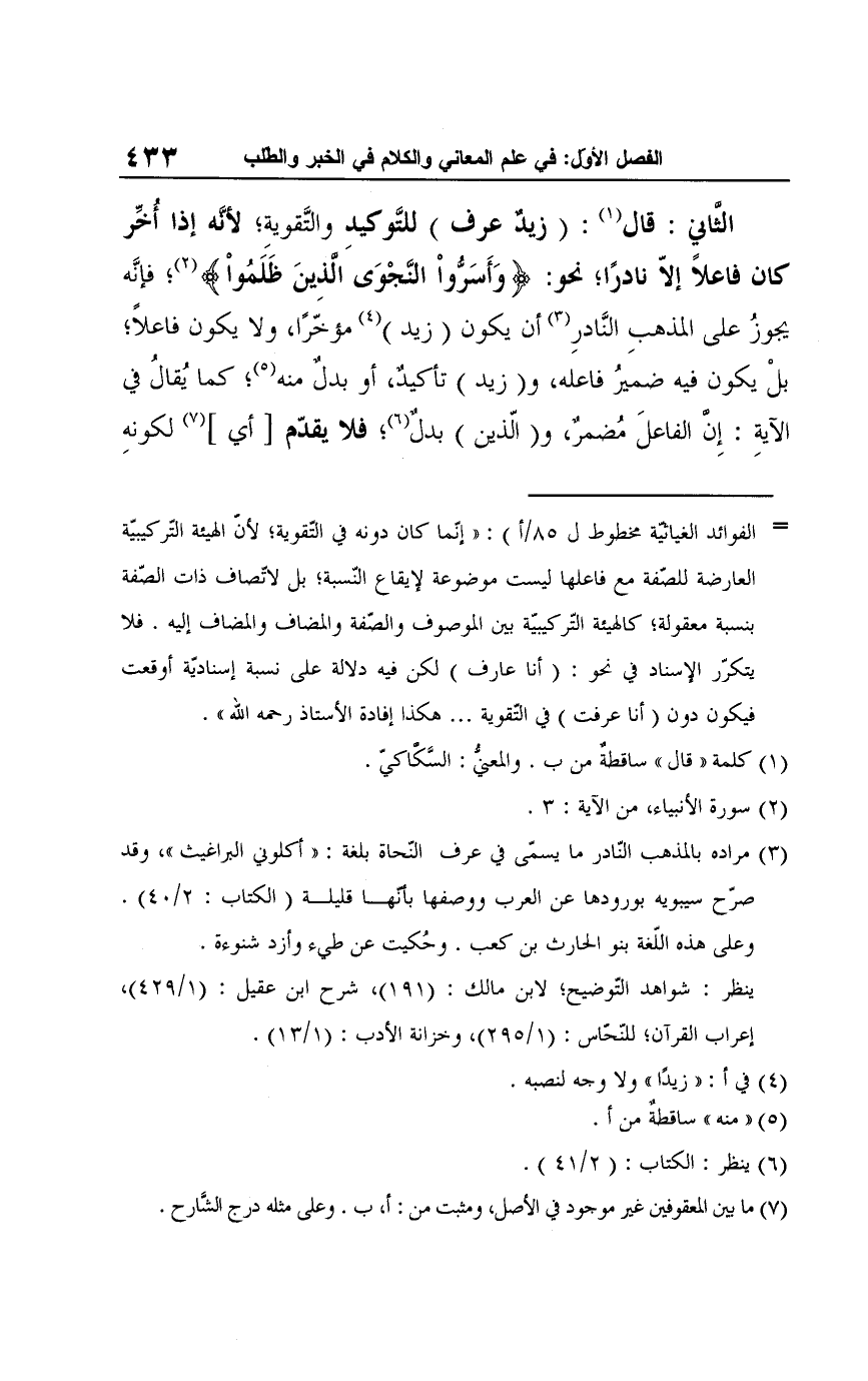 الثَّاني: قال (¬1): (زيدٌ عرف) للتَّوكيدِ والتَّقويةِ؛ لأنَّه إذا أُخِّر كان فاعلًا إلّا نادرًا؛ نحو: {وَأَسَرُّوا النَّجْوَى الَّذِينَ ظَلَمُوا} (¬2)؛ فإنَّه يجوزُ على المذهبِ النَّادرِ (¬3) أن يكون (زيد) (¬4) مؤخَّرًا، ولا يكون فاعلًا؛ بلْ يكون فيه ضميرُ فاعله، و (زيد) تأكيدٌ، أو بدلٌ منه (¬5)، كما يُقالُ في الآيةِ: إِن الفاعلَ مُضمرٌ، و (الّذين) بدلٌ (¬6)، فلا يقدّم [أي] (¬7) لكونهِ
