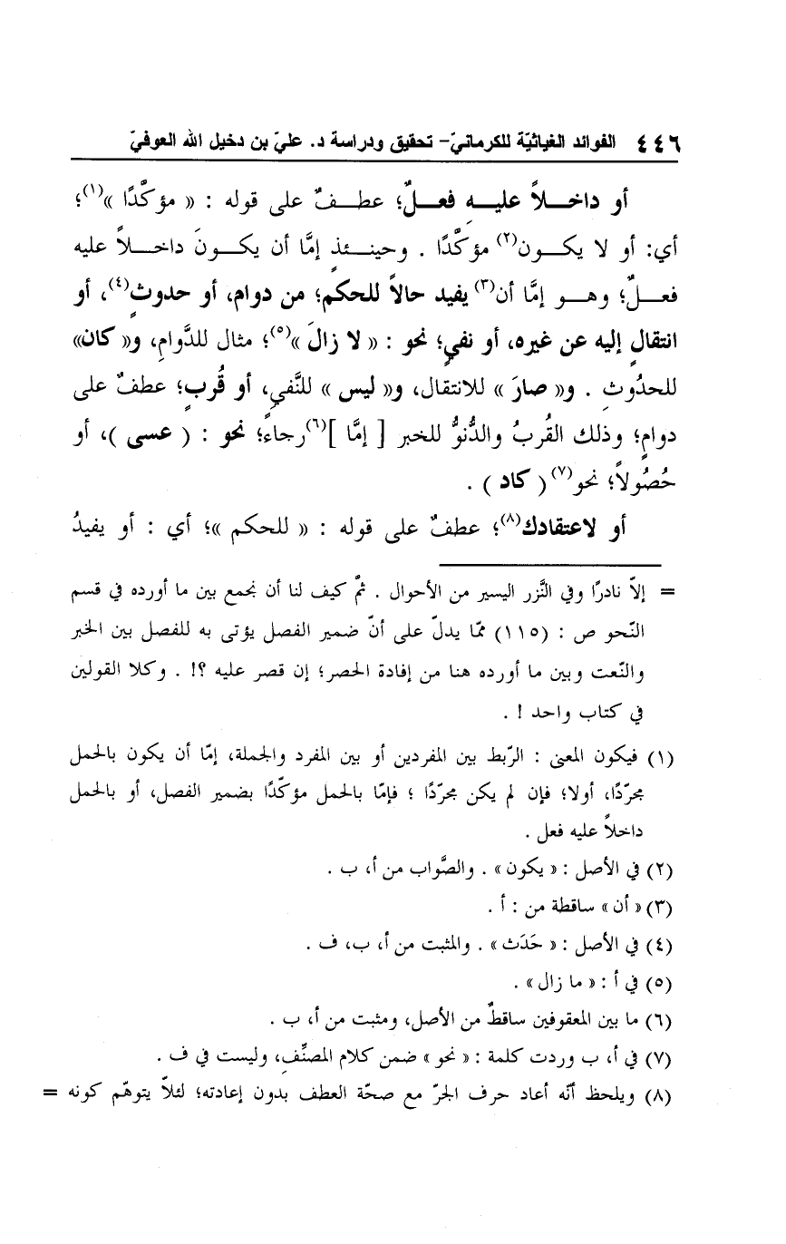 = إلَّا نادرًا وفي النَّزر اليسير من الأحوال. ثم كيف لنا أن نجمع بين ما أورده في قسم النّحو ص: (115) ممّا يدل على أنّ ضمير الفصل يؤتى به للفصل بين الخبر والنّعت وبين ما أورده هنا من إفادة الحصر؛ إن قصر عليه؟!. وكلا القولين في كتاب واحد!.