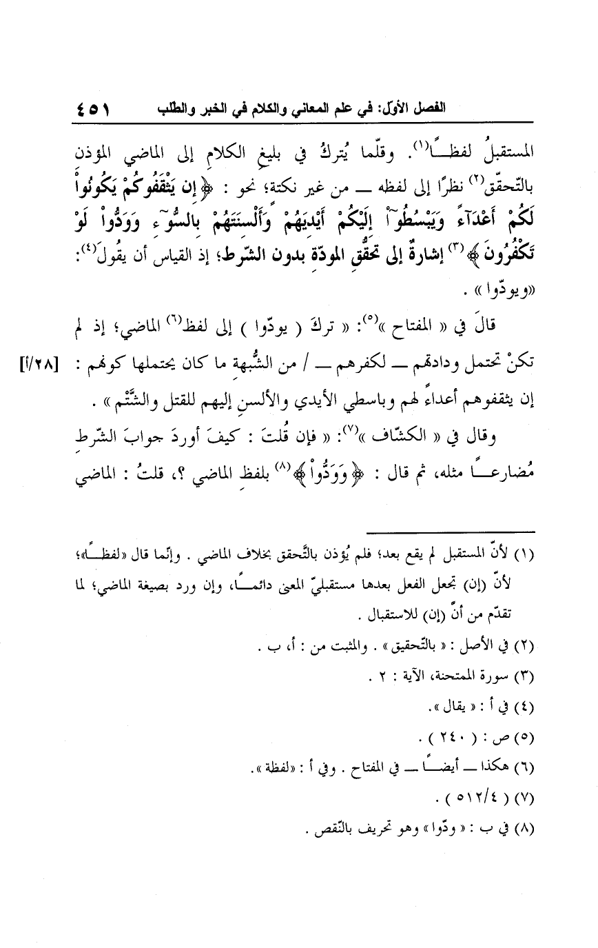 المستقبلُ لفظًا (¬1). وقلّما يُتركُ في بليغ الكلامِ إلى الماضي المؤذنِ بالتّحقّق (¬2) نظرًا إلى لفظه- من غير نكتةٍ؛ نحو: {إِنْ يَثْقَفُوكُمْ يَكُونُوا لَكُمْ أَعْدَاءً وَيَبْسُطُوا إِلَيْكُمْ أَيْدِيَهُمْ وَأَلْسِنَتَهُمْ بِالسُّوءِ وَوَدُّوا لَوْ تَكْفُرُونَ} (¬3) إشارة إلى تحقُّقِ المودّةِ بدون الشّرَط؛ إذ القياس أن يقُولَ (¬4): "ويودّوا".