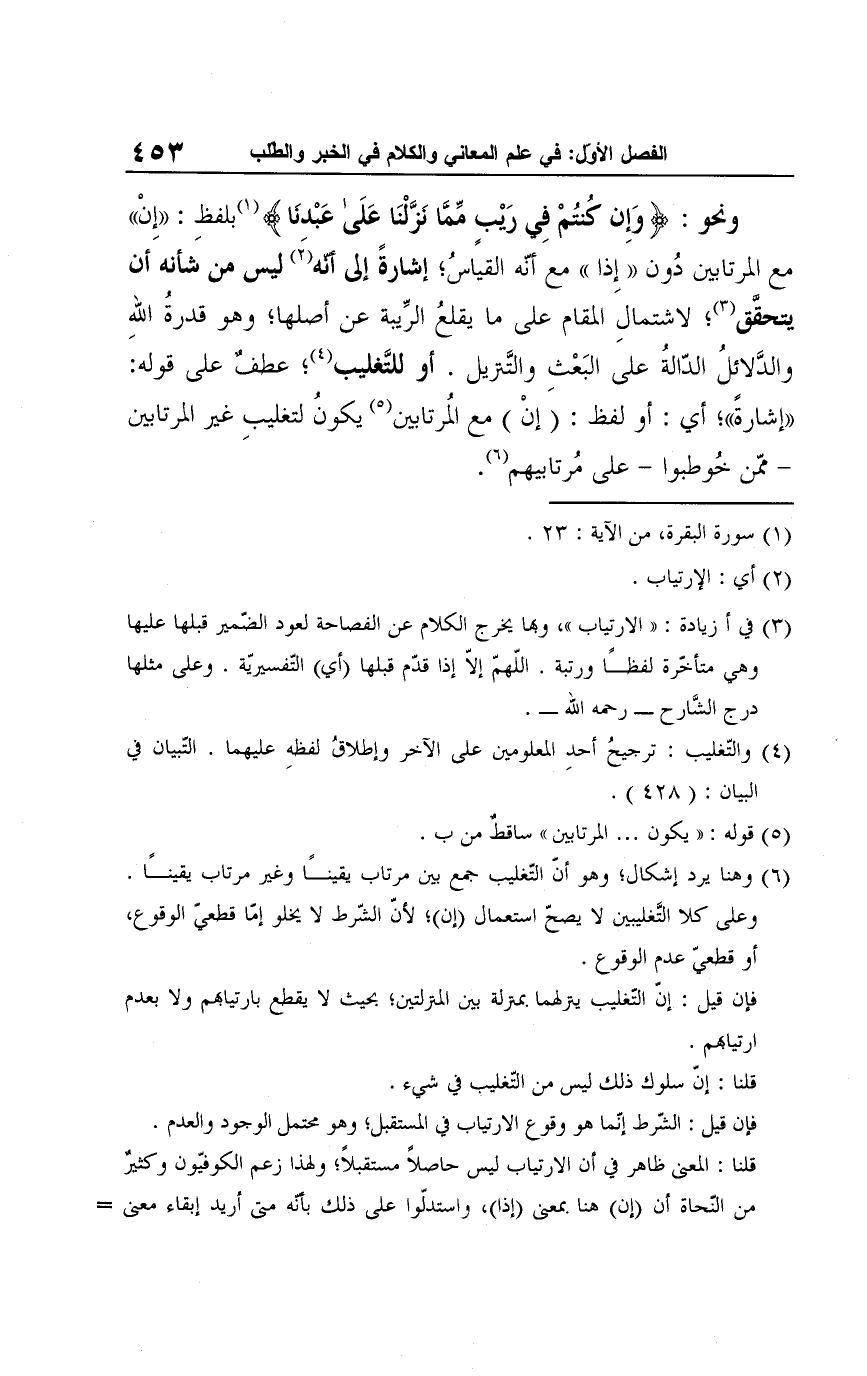 ونحو: {وَإِنْ كُنْتُمْ فِي رَيْبٍ مِمَّا نَزَّلْنَا عَلَى عَبْدِنَا} (¬1) بلفظِ: "إِنْ" مع المرتابين دُون "إِذا" مع أنّه القياسُ؛ إشارةً إلى أنَّه (¬2) ليس من شأنه أن يتحقق (¬3)؛ لاشتمالِ المقام على ما يقلعُ الرِّيبة عن أصلها؛ وهو قدرةُ اللهِ والدَّلائلُ الدّالةُ على البَعثِ والتَّنزيل. أو للتَّغليب (¬4)؛ عطفٌ على قوله: "إشارةً"؛ أي: أو لفظ: (إنْ) مع المُرتابين (¬5) يكونُ لتغليبِ غير المرتابين -ممّن خُوطبوا- على مُرتابيهم (¬6).