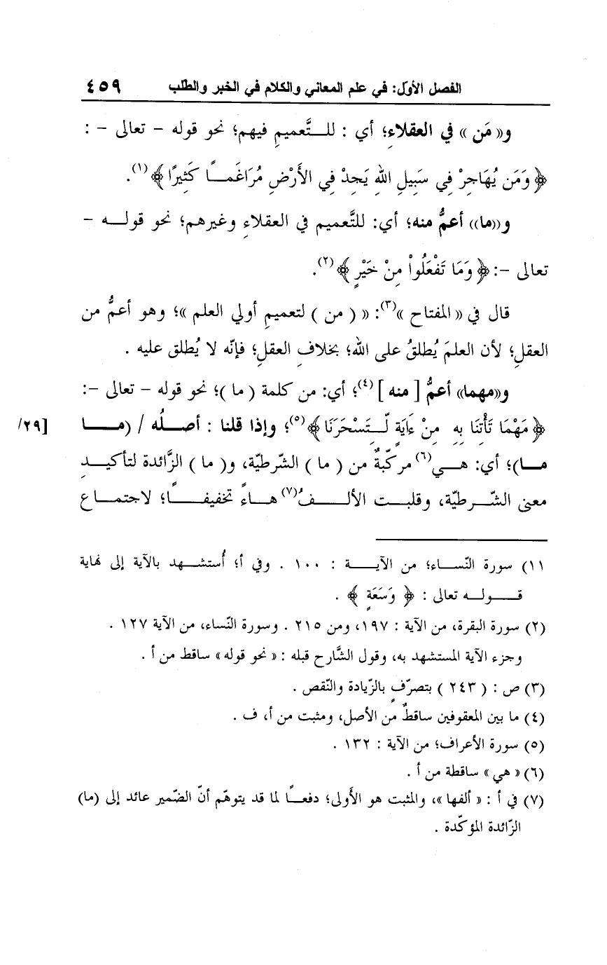 و "مَن" في العقلاء؛ أي: للتَّعميمِ فيهم؛ نحو قوله -تعالى-: {وَمَنْ يُهَاجِرْ فِي سَبِيلِ اللهِ يَجِدْ فِي الْأَرْضِ مُرَاغَمًا كَثِيرًا} (¬1).
