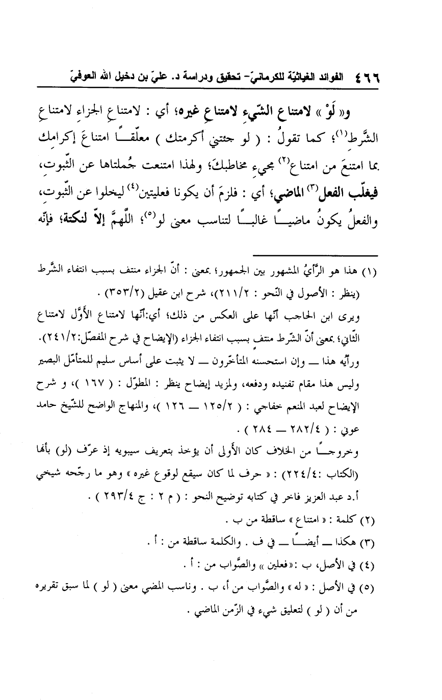 ويرى ابن الحاجب أنّها على العكس من ذلك؛ أي: أنّها لامتناع الأَوَّل لامتناع الثَّاني؛ بمعنى أن الشّرط منتفٍ بسبب انتفاء الجزاء (الإيضاح في شرح المفصّل: 2/ 241).