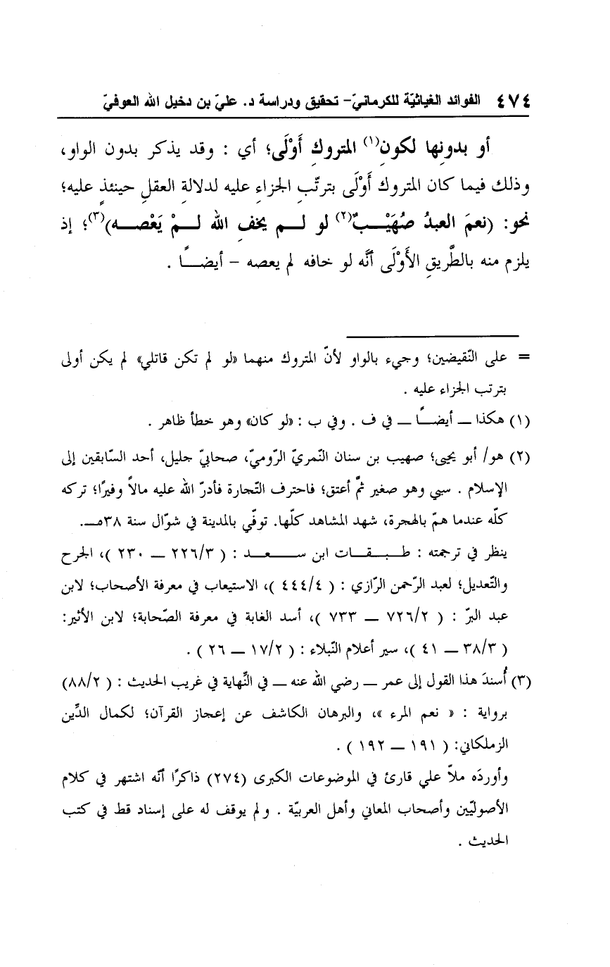 أو بدونها لكونِ (1) المتروكِ أَوْلَى؛ أي: وقد يذكر بدون الواو، وذلك فيما كان المتروك أَوْلَى بترتّبِ الجزاءِ عليه لدلالةِ العقلِ حينئذ عليه؛ نحو: (نعمَ العبدُ صُهَيْبٌ (¬2) لو لم يخفِ الله لمْ يَعْصه) (¬3)؛ إذ يلزم منه بالطريقِ الأَوْلَى أنَّه لو خافه لم يعصه- أيضًا.