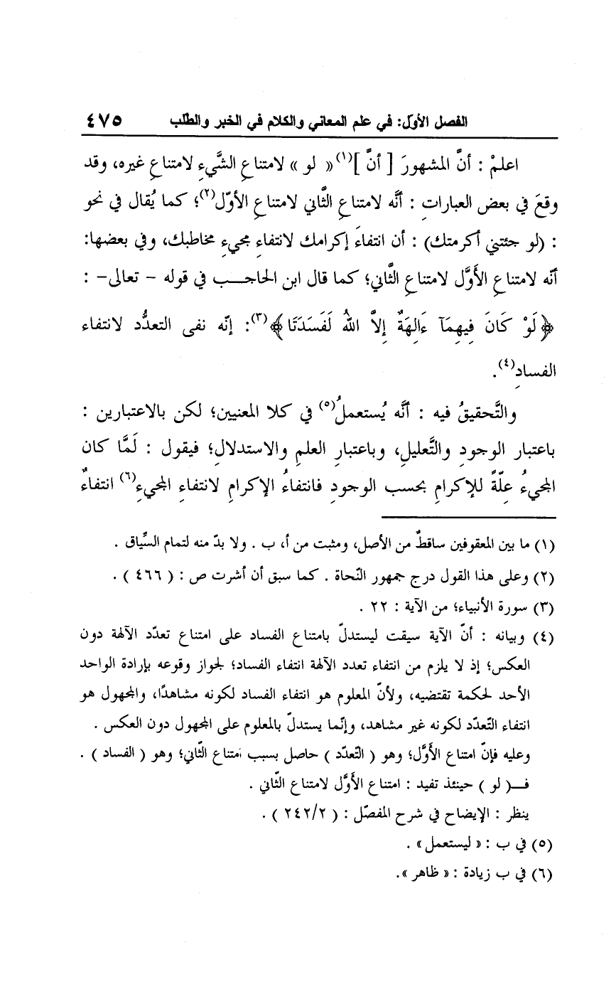 (¬4) وبيانه: أنّ الآية سيقت ليستدلّ بامتناع الفساد على امتناع تعدّد الآلهة دون العكس؛ إذ لا يلزم من انتفاء تعدد الآلهة انتفاء الفساد؛ لجواز وقوعه بإرادة الواحد الأحد لحكمة تقتضيه، ولأنّ المعلوم هو انتفاء الفساد لكونه مشاهدًا، والمجهول هو انتفاء التعدد لكونه غير مشاهد، وإنَّما يستدلّ بالمعلوم على المجهول دون العكس.