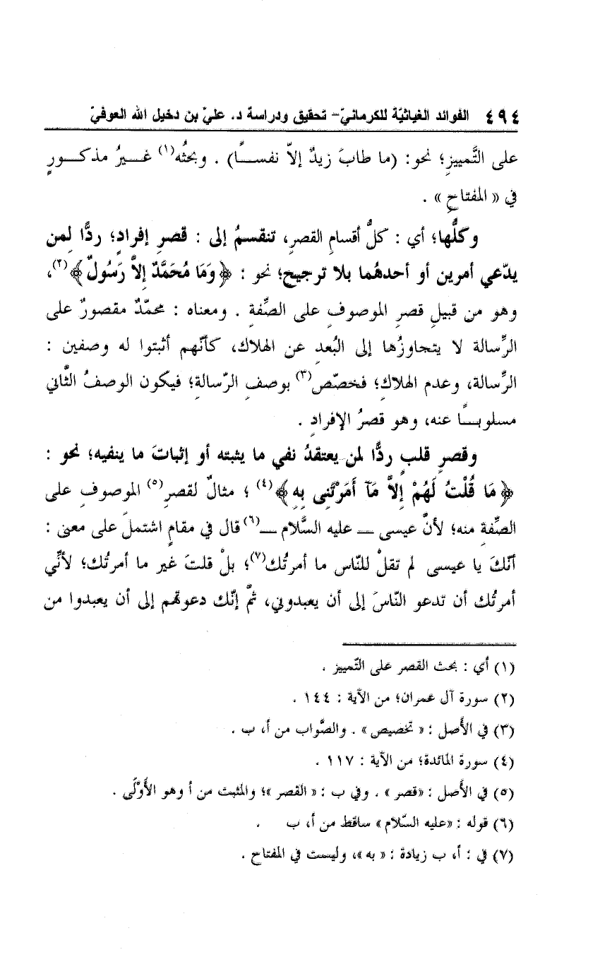 وقصر قلب ردًّا لمن يعتقدُ نفي ما يثبته أو إثبات ما ينفيه؛ نحو: {مَا قُلْتُ لَهُمْ إلا مَا أَمَرْتَنِي بِهِ} (¬4)؛ مثالٌ لقصرِ (¬5) الموصوفِ على الصِّفةِ منه؛ لأنَّ عيسى -عليه السَّلام - (¬6) قال في مقامٍ اشتمل على معنى: أنَّكَ يا عيسى تقلْ للنَّاس ما أمرتك (¬7) بل قلت غير منها أمرتك، لأنِّي أمرتُك أن تدعو النَّاس إلى أن يعبدوني، ثم إنك دعوتهم إلى أن يعبدوا من