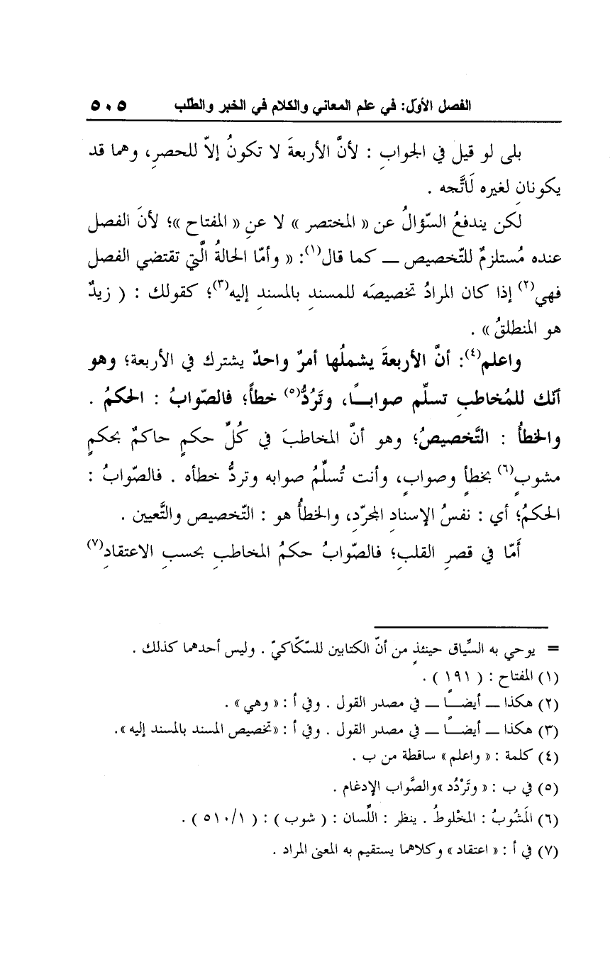 (¬3) هكذا -أيضًا- في مصدر القول. وفي أ: "تخصيص المسند بالمسند إليه".