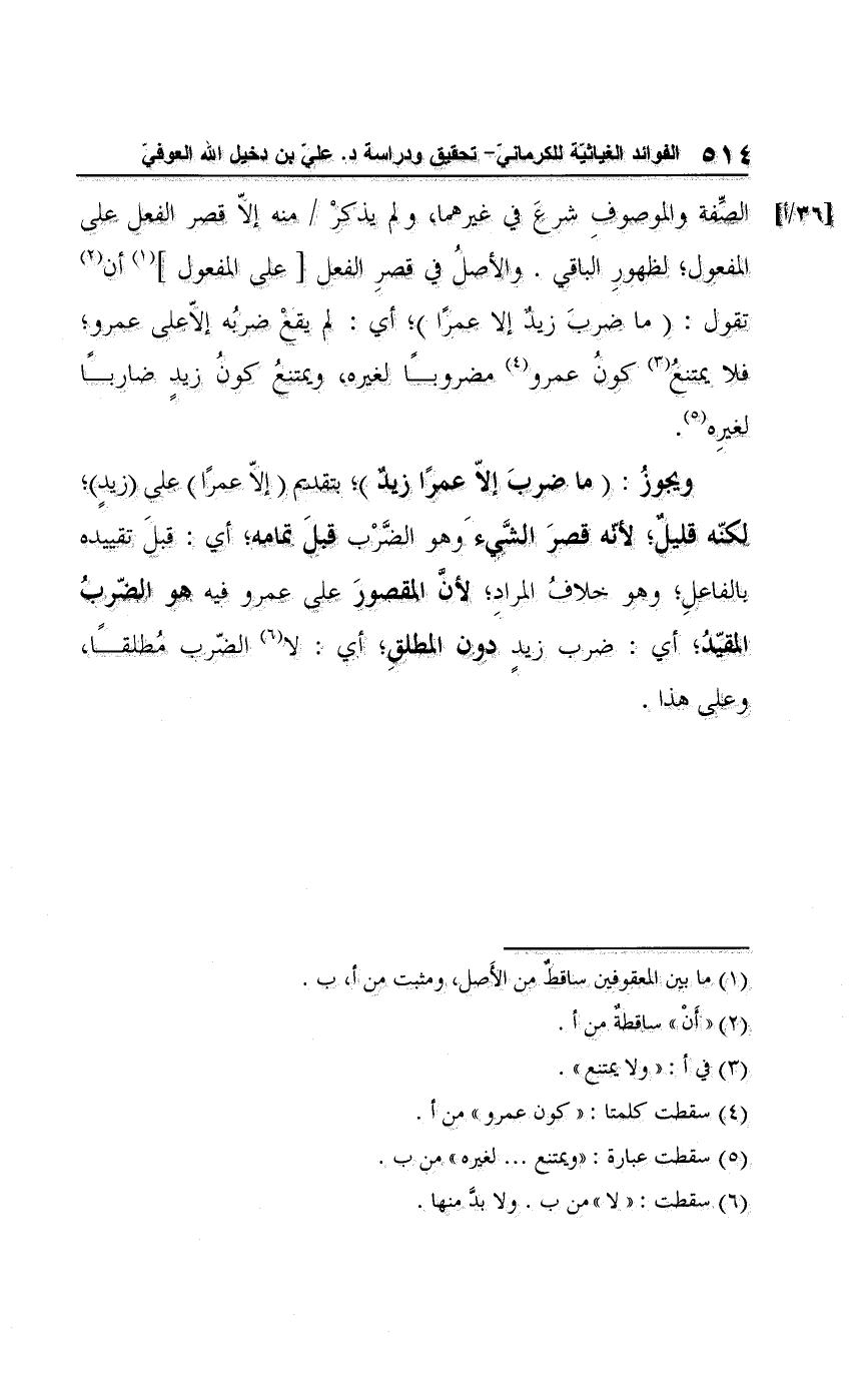 الصِّفة والموصوفِ شرعَ في غيرها، ولم يذكرْ منه إلَّا قصر الفعل على المفعول؛ لظهورِ الباقي. والأصلُ في قصرِ الفعل [على المفعول] (¬1) أن (¬2) تقول: (ما ضربَ زيدٌ إلا عمرًا)؛ أي: لم يقع ضربُه إلّا على عمر؛ فلا يمتنعُ (¬3) كونُ عمرو (¬4) مضروبًا لغيره، ويمتنعُ كونُ زيدٍ ضاربًا لغيره (¬5).