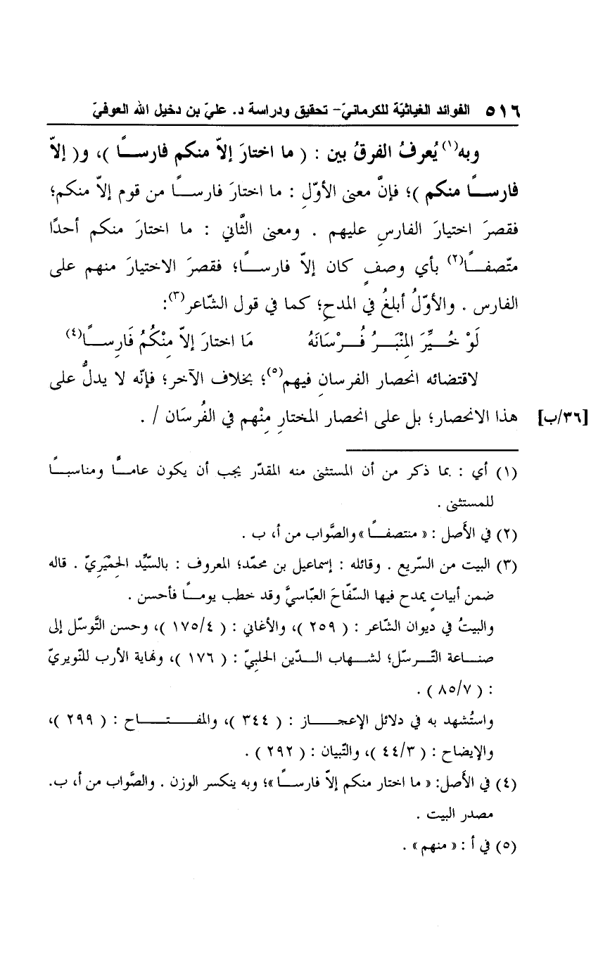 وبه (¬1) يُعرفُ الفرقُ بين: (ما اختارَ إلّا منكم فارسًا)، و (إلّا فارسًا منكم)؛ فإنَّ معنى الأوّلِ: ما اختارَ فارسًا من قوم إلّا منكم؛ فقصرَ اختيارَ الفارسِ عليهم. ومعنى الثَّاني: ما اختارَ منكم أحدًا متّصفًا (¬2) بأي وصفٍ كان إلّا فارسًا؛ فقصرَ الاختيارَ منهم على الفارس. والأوّلُ أبلغُ في المدح؛ كما في قول الشّاعر (¬3):
