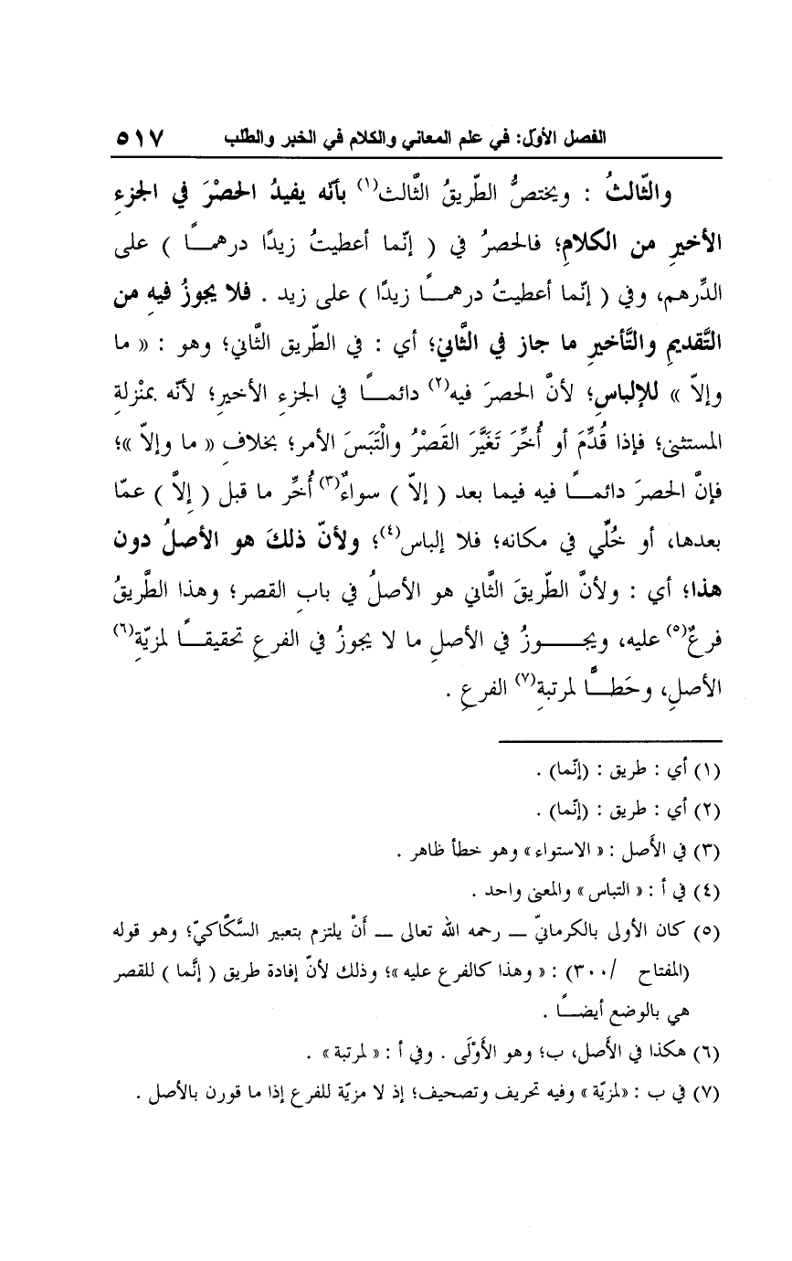 (¬5) كان الأولى بالكرمانيّ -رحمه الله تعالى- أَنْ يلتزم بتعبير السَّكاكيّ؛ وهو قوله (المفتاح / 300): "وهذا كالفرع عليه"؛ وذلك لأنّ إفادة طريق (إنَّما) للقصر هي بالوضع أيضًا.