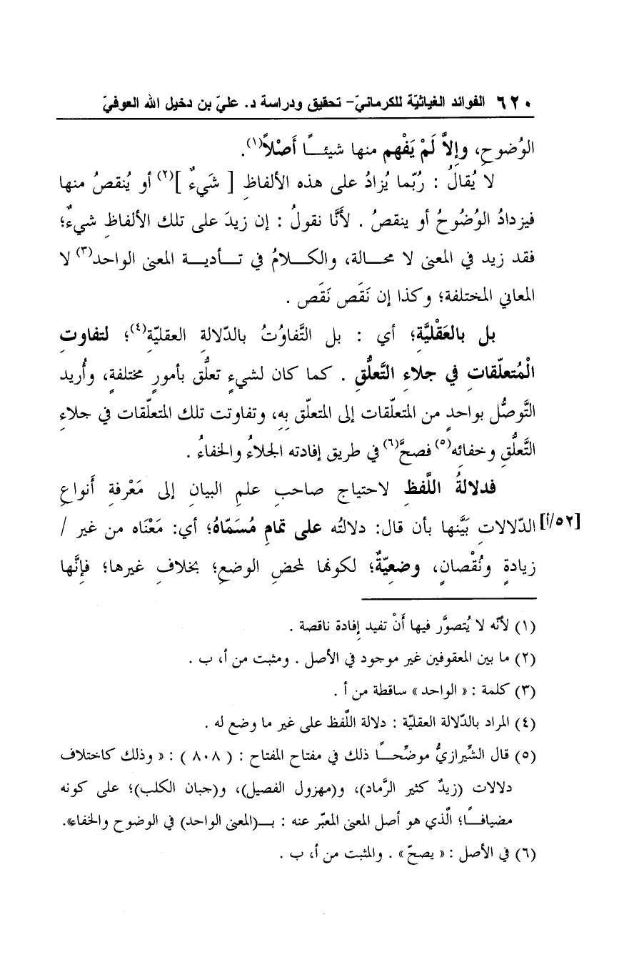 (¬5) قال الشِّيرازيُّ موضِّحًا ذلك في مفتاح المفتاح: (808): "وذلك كاختلاف دلالات (زيدٌ كثير الرَّماد)، و (مهزول الفصيل)، و (جبان الكلب)؛ على كونه مضيافًا؛ الّذي هو أصل المعنى المعبّر عنه: بـ (المعنى الواحد) في الوضوح والخفاء".