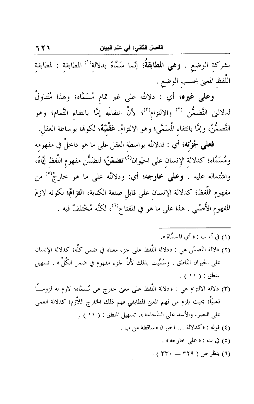 (¬3) دلالة الالتزام هي: "دلالة اللَّفظ على معنى خارج عن مُسمَّاه؛ لازم له لزومًا ذهنيًّا؛ بحيث يلزم من فهم المعنى المطابقي فهم ذلك الخارج اللَّازم؛ كدلالة العمى على البصر، والأسد على الشّجاعة". تسهيل المنطق: (11).