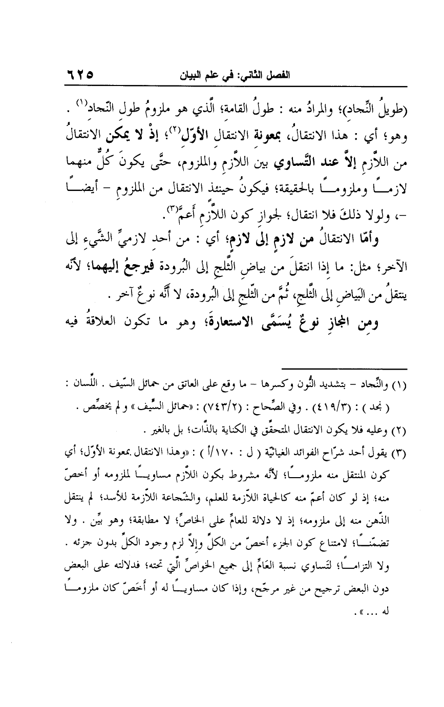 (¬3) يقول أحد شرّاح الفوائد الغياثيّة (ل: 170 / أ): "وهذا الانتقال بمعونة الأوّل؛ أي كون المنتقل منه ملزومًا؛ لأنَّه مشروط بكون اللَّازم مساويًا لملزومه أو أخصّ منه؛ إذ لو كان أعمّ منه كالحياة اللّازمة للعلم، والشّجاعة اللّازمة للأسد؛ لم ينتقل الذّهن منه إلى ملزومه؛ إذ لا دلالة للعامِّ على الخاصِّ؛ لا مطابقة؛ وهو بيِّن. ولا تضمّنًا؛ لامتناع كون الجزء أخصّ من الكلِّ وإِلَّا لزم وجود الكلِّ بدون جزئه. ولا التزامًا؛ لتَساوي نسبة العَامِّ إلى جميع الخواصِّ الّتي تحته؛ فدلالته على البعض دون البعض ترجيح من غير مرجّح، وإذا كان مساويًا له أو أَخَصّ كان ملزومًا له ... ".
