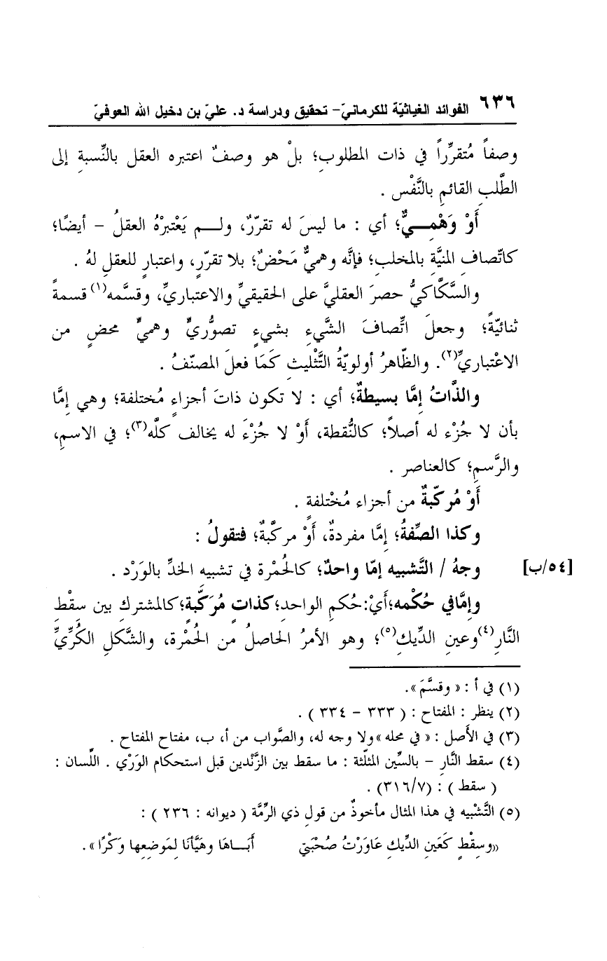 والسَّكَّاكَيُّ حصرَ العقليَّ على الحقيقيِّ والاعتباريِّ، وقسَّمه (¬1) قسمةً ثنائيّةً؛ وجعلَ اتِّصافَ الشَّيءِ بشيءٍ تصوُّريٍّ وهميٍّ محضٍ من الاعْتباريِّ (¬2). والظّاهرُ أولويّةُ التَّثْليث كَمَا فعلَ المصنّفُ.
