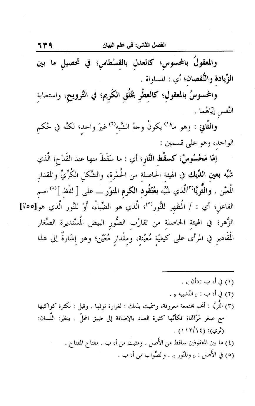 إمّا مَحْسُوسٌ، كسقْطِ النَّارِ، أي: ما سَقَطَ منها عند القَدْح؛ الَّذي شُبِّه بعينِ الدِّيك في الهيئة الحاصلةِ من الحُمْرةِ، والشَّكلِ الكُرِّيِّ والمقدارِ المُعيَّن. والثُّريَّا (¬3) الَّذي شُبِّه بعُنْقُودِ الكرمِ المنوّر - على [لفْظِ] (¬4) اسمِ الفاعلِ، أي: المُظهِر للنُّور (¬5)؛ الَّذي هو الضِّياءُ، أَوْ للنَّور الَّذي هو الزَّهر؛ في الهيئةِ الحاصلةِ من تقارُبِ الصُّورِ البيض المُسْتديرة الصِّغار المَقَاديرِ في المرأى على كيفيّةٍ مُعيّنةٍ، ومِقْدارٍ مُعَيّن، وهو إِشَارةٌ إلى هذا