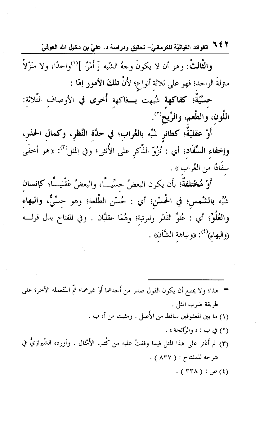 أَوْ مُخْتلفةٌ؛ بأَن يكون البعضُ حِسِّيًّا، والبعضُ عَقْليًّا؛ كإنسانٍ شُبِّه بالشَّمسِ؛ في الحُسْنِ؛ أي: حُسْن الطَّلعةِ؛ وهو حِسِّيٌّ، والبهاءِ والعُلُوِّ؛ أي: عُلوِّ القَدْر والمرتبةِ؛ وهُمَا عقليَّان. وفي المفتاح بدل قوله (والبهاءِ) (¬4): "ونباهةِ الشَّأنِ".