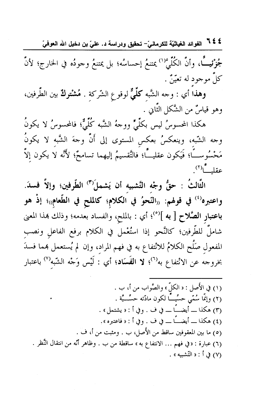 الثَّالثُ: حقُّ وجْه التَّشبيهِ أن يَشملَ (¬3) الطّرفين؛ وإلَّا فسدَ. واعتبره (¬4) في قولهم: "النَّحوُ في الكلامِ؛ كالملحِ في الطّعامِ"؛ إذْ هو باعتبارِ الصَّلاح [به] (¬5)؛ أي: بالملحِ، والفساد بعدمه؛ وذلك بهذا المعنى شاملٌ للطّرفين؛ كالنَّحو إذا استُعْمل في الكلام برفع الفاعلِ ونصبِ المفعولِ صَلُح الكلامُ للانْتفاع به في فهم المرادِ، وإن لم يُستعمل بهما فسدَ بخروجه عن الانْتفاع به (¬6)؛ لا الفَسَاد؛ أي: لَيْس وَجْه الشّبهِ (¬7) باعتبار