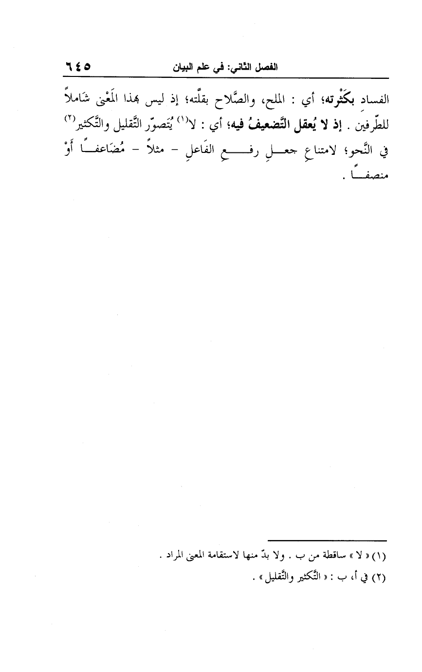 الفسادِ بكَثْرته؛ أي: الملح، والصَّلاح بقلَّته، إذ ليس بهذا المَعْنى شَاملًا للطرّفين. إذ لا يُعقل التَّضعيفُ فيه؛ أي: لا (¬1) يُتَصوّر التَّقليل والتَّكثير (¬2) في النَّحو؛ لامتناعِ جعلِ رفع الفَاعلِ -مثلًا- مُضَاعفًا أَوْ منصفًا.