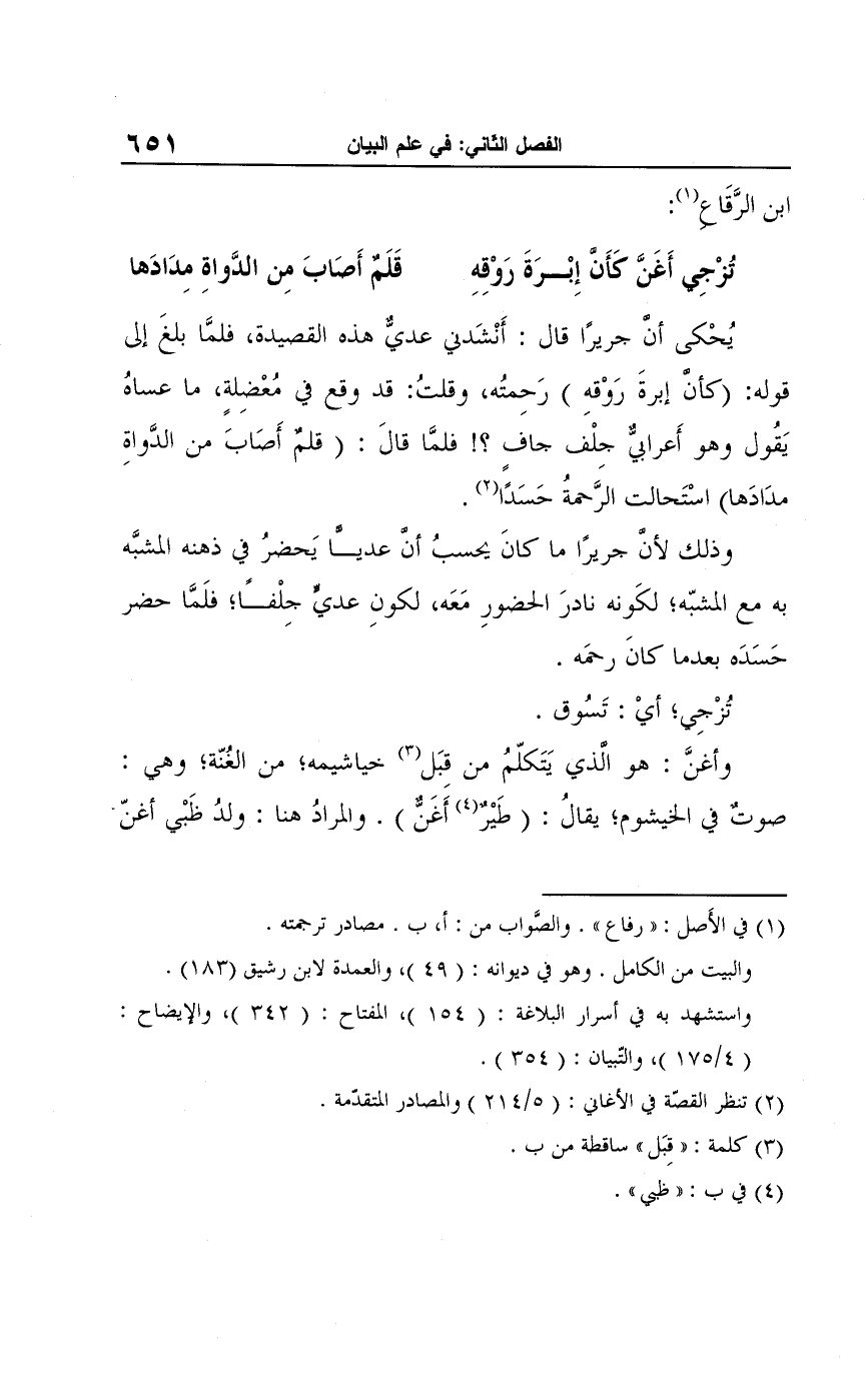 يُحْكى أن جريرًا قال: أَنْشَدني عديٌّ هذه القصيدة، فلمَّا بلغَ إلى قوله: (كأنَّ إبرةَ رَوْقهِ) رَحِمتُه، وقلتُ: قد وقع في مُعْضِلةٍ، ما عساهُ يَقُول وهو أَعرابيٌّ جِلْف جافٍ؛! فلمَّا قال: (قلمٌ أَصَابَ من الدَّواةِ مدَادَها) اسْتَحالت الرَّحمةُ حَسَدًا (¬2).