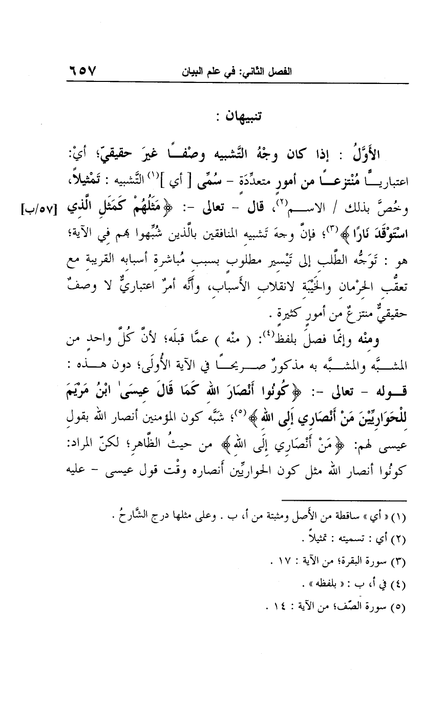 ومنه وإنما فصل بلفظ (¬4): (منْه) عمَّا قبلَه؛ لأن كُل واحدٍ من الشبَّه والمشبَّه به مذكورٌ صريحًا في الآية الأُولَى؛ دون هذه: قوله -تعالى-: {كُونُوا أَنْصَارَ اللَّهِ كَمَا قَال عِيسَى ابْنُ مَرْيَمَ لِلْحَوَارِيِّينَ مَنْ أَنْصَارِي إِلَى اللَّهِ} (¬5)، شَبَّه كون المؤمنين أنصار الله بقولِ عيسى لهم: {مَنْ أَنْصَارِي إِلَى اللَّه} من حيثُ الظاهرِ، لكنّ المراد: كونُوا أنصار الله مثل كون الحواريِّين أَنصاره وقْت قول عيسى -عليه