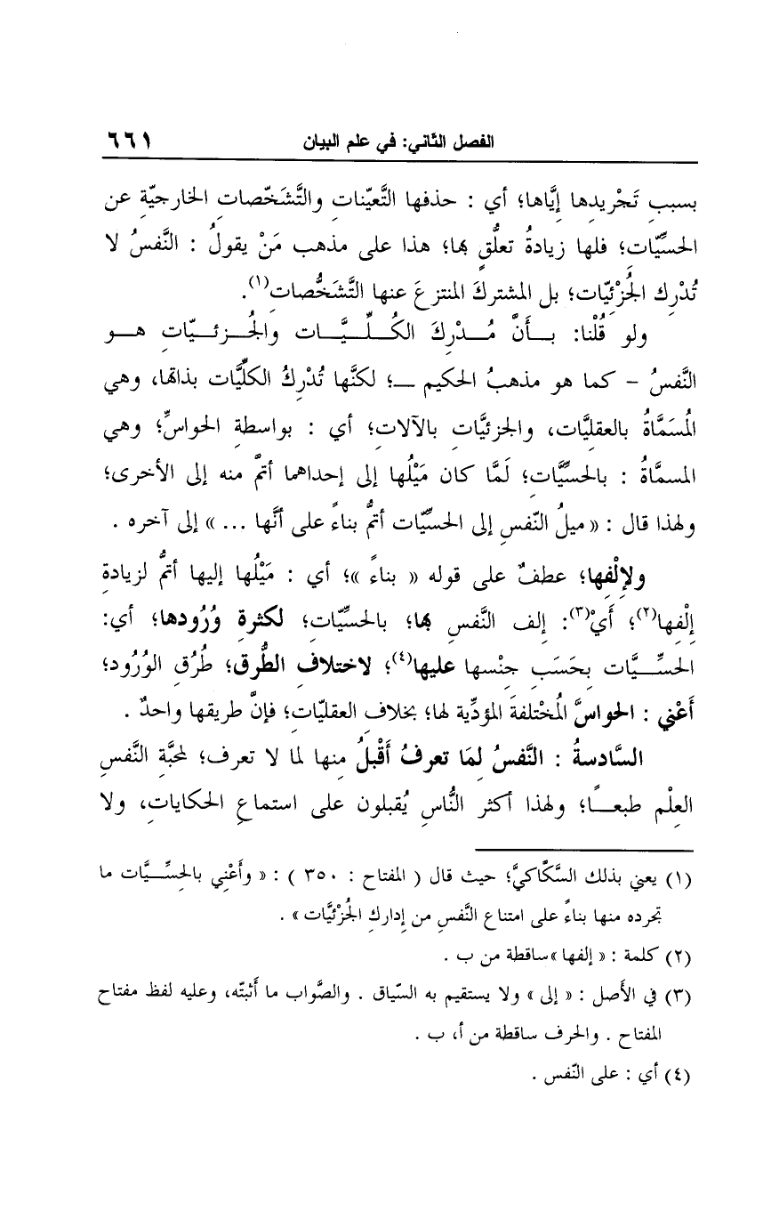 (¬1) يعني بذلك السَّكاكيَّ؛ حيث قال (المفتاح: 350): "وأَعْنِي بالحِسِّيَّات ما تجرده منها بناءً على امتناع النَّفسِ من إِداركِ الجُزْئيَّات".