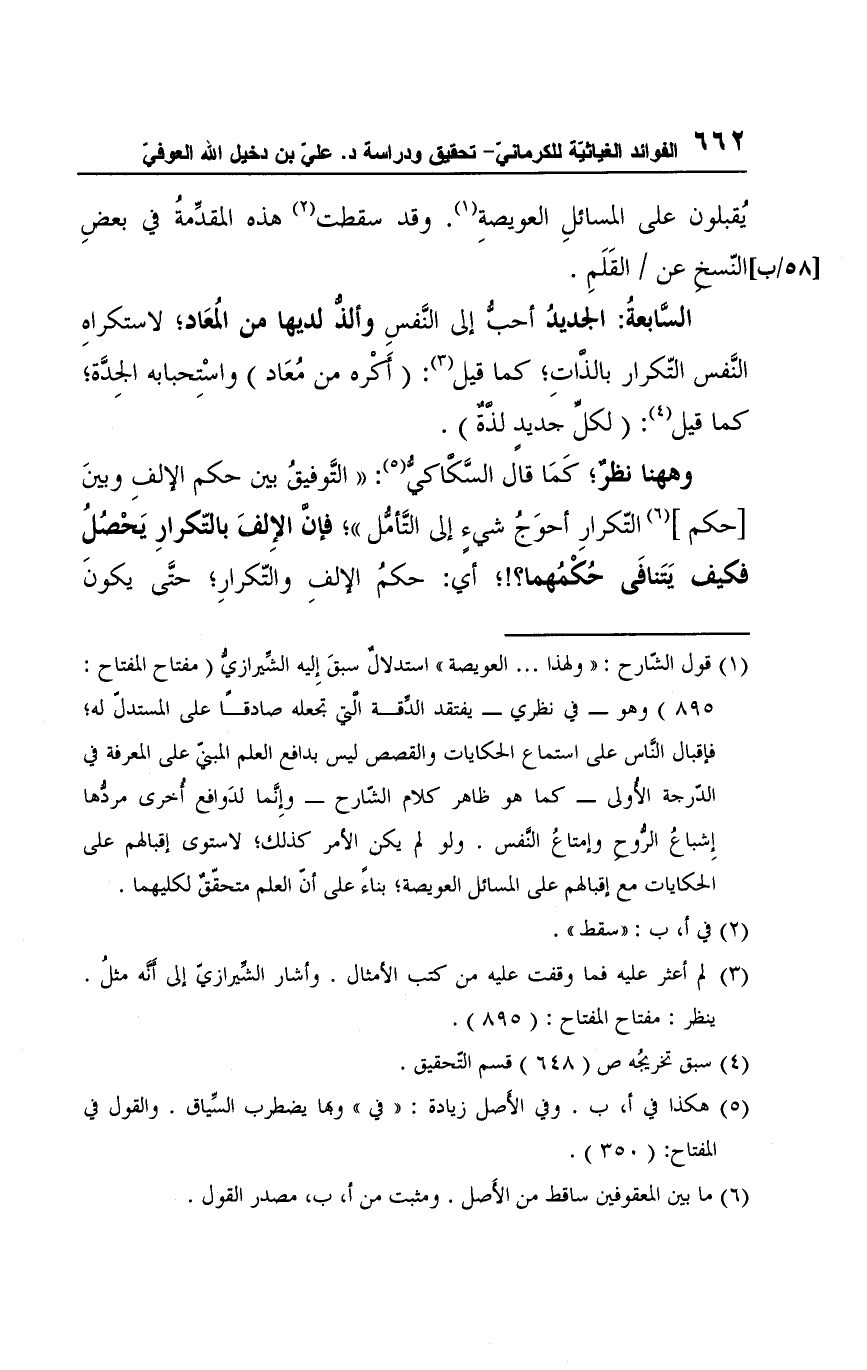 السابعةُ: الجديدُ أحبُّ إلى النَّفسِ وألذُّ لديها من المُعَاد؛ لاستكراهِ النَّفس التّكرار بالذاتِ؛ كما قيل (¬3): (أَكْره من مُعَاد) واسْتِحبابه الجِدَّة، كما قيل (¬4): (لكلِّ جديد لذةٌ).