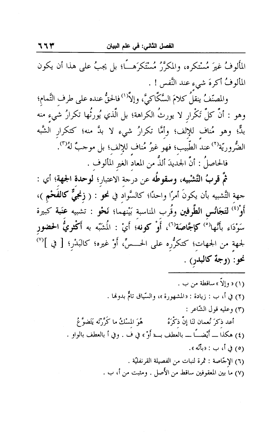 والمصنّفُ ينقلُ كلامَ السَّكاكيَّ، وإلَّا (¬1) فالحقُّ عنده على طرفِ التَّمامِ؛ وهو: أن كل تَكْرارِ لا يورثُ الكراهة؛ بل الذي يُورثُها تكرارُ شيءٍ منه بدٌّ؛ وهو مُنافٍ للإِلف؛ وأمَّا تكرارُ شيء لا بدَّ منه؛ كتكرارِ الشَّبه الضُّروريّة (¬2) عند الطيبِ؛ فهو غيرُ مُنافٍ للإِلفِ؛ بل موجبٌ لهُ (¬3).
