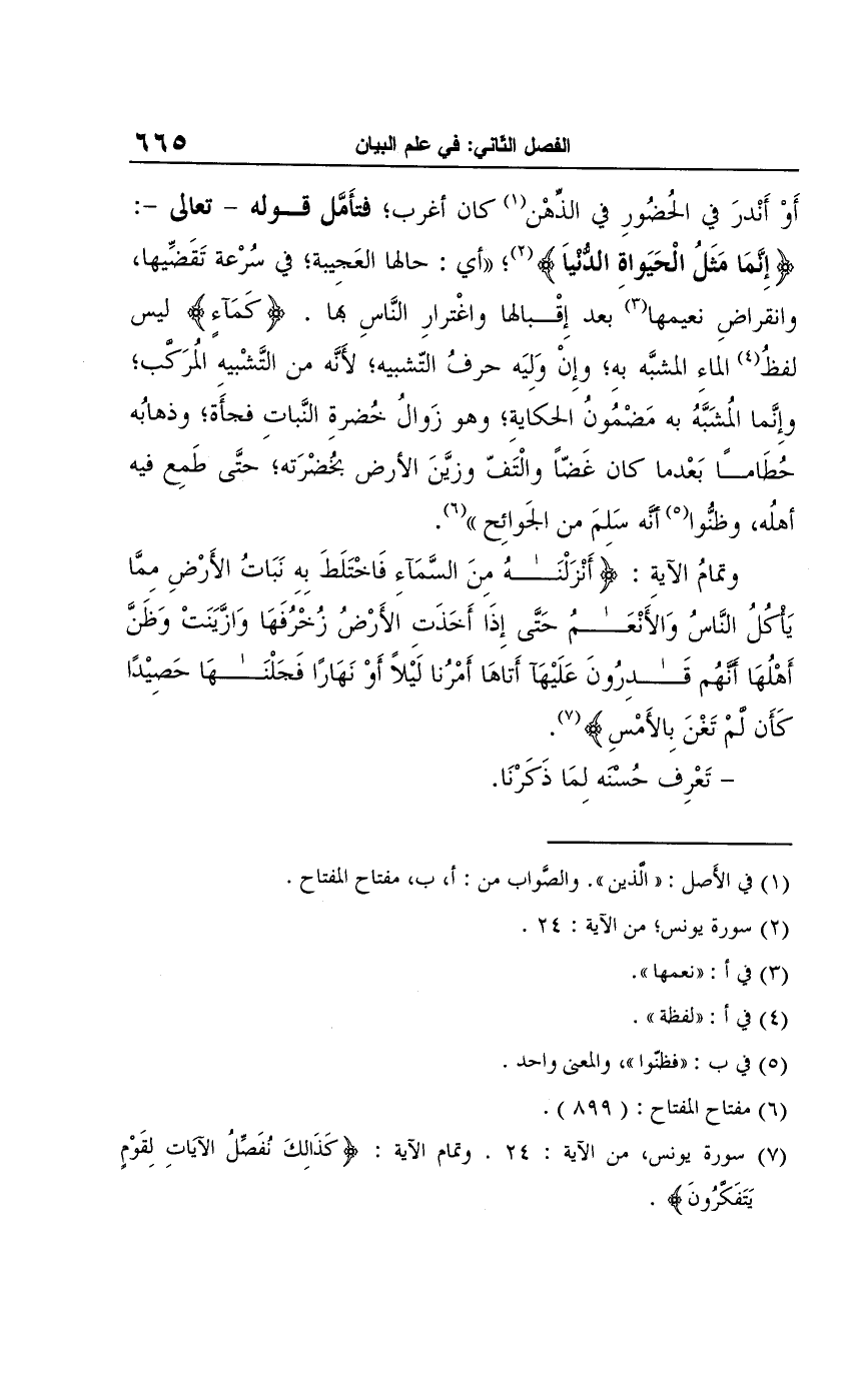 وتمامُ الآية {أَنْزَلْنَاهُ مِنَ السَّمَاءِ فَاخْتَلَطَ بِهِ نَبَاتُ الْأَرْضِ مِمَّا يَأْكُلُ النَّاسُ وَالْأَنْعَامُ حَتَّى إِذَا أَخَذَتِ الْأَرْضُ زُخْرُفَهَا وَازَّيَّنَتْ وَظَنَّ أَهْلُهَا أَنَّهُمْ قَادِرُونَ عَلَيْهَا أَتَاهَا أَمْرُنَا لَيْلًا أَوْ نَهَارًا فَجَعَلْنَاهَا حَصِيدًا كَأَنْ لَمْ تَغْنَ بِالْأَمْسِ} [يونس: 24] (¬7).