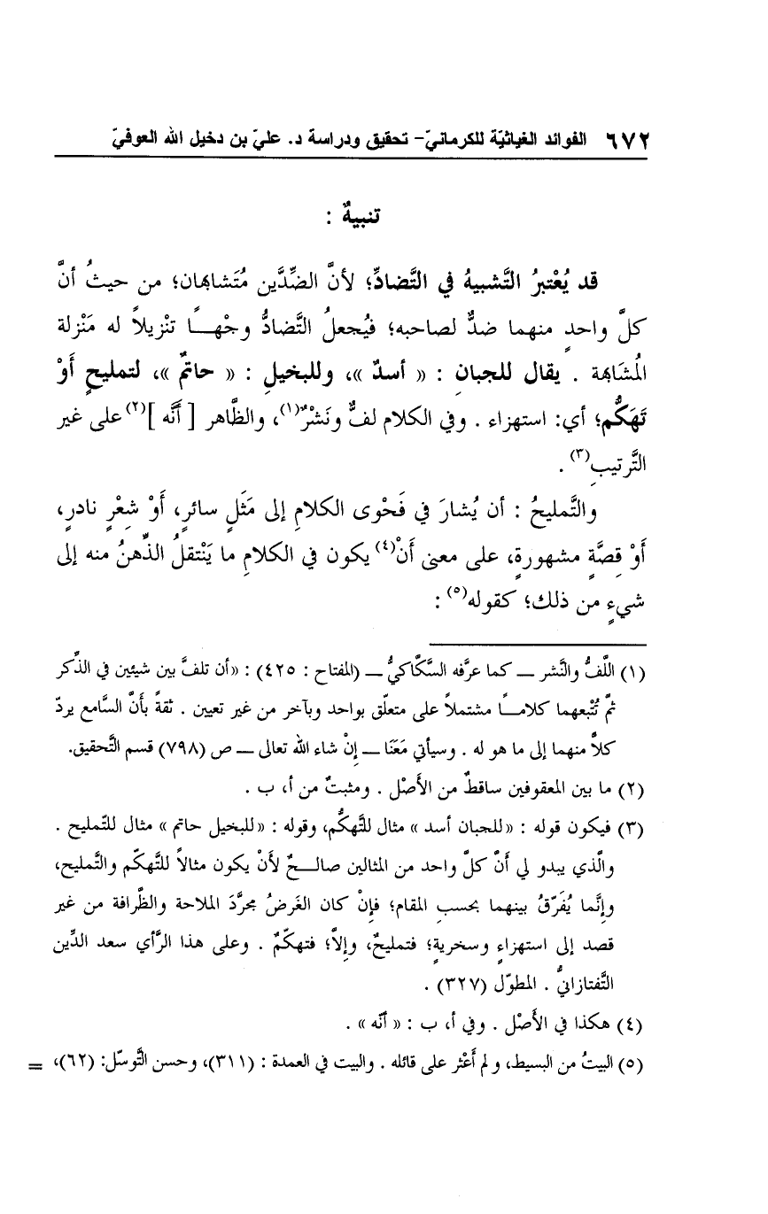 (¬3) فيكون قوله: "للجبان أسد" مثال للتهكم، وقوله: "للبخيل حاتم" مثال للتّمليح. والذي يبدو لي أن كل واحد من المثالين صالح لأَنْ يكون مثالًا للتَّهكّم والتَّمليح، وإنما يُفَرّقُ بينهما بحسبِ المقام؛ فإنْ كان الغَرضُ مجرَّدَ الملاحة والظرافة من غير قصد إلى استهزاء وسخريةٍ؛ فتمليحٌ، وإلا؛ فتهكّم. وعلى هذا الرَّأي سعد الدّين التَّفتازاني. المطوّل (327).