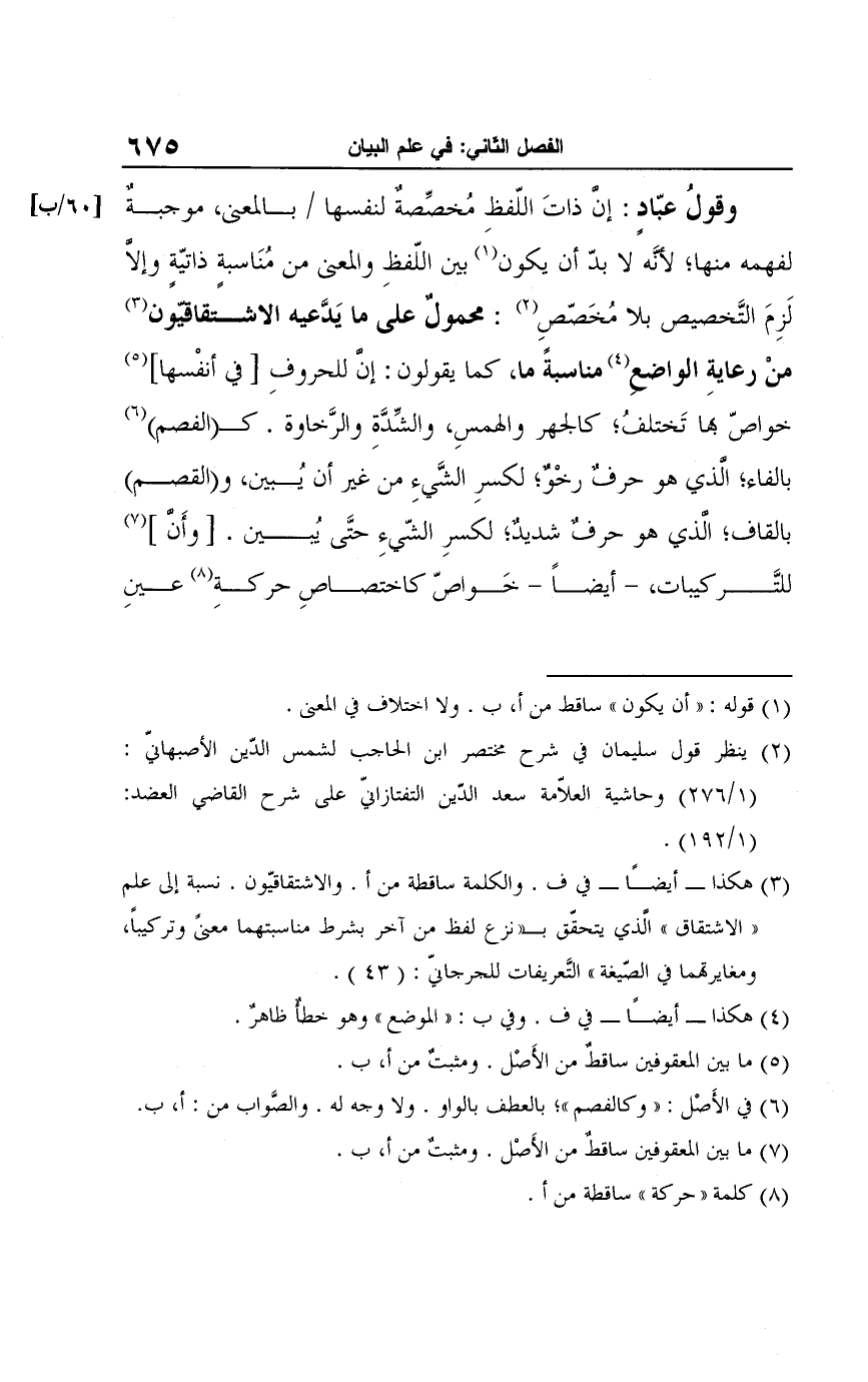 وقولُ عبّادٍ: إن ذاتَ اللّفظ مُخصِّصةٌ لنفسها بالمعنى، موجبةٌ لفهمه منها؛ لأنَّه لا بدّ أن يكون (¬1) بين اللّفظِ والمعنى من مُنَاسبةٍ ذاتيّةٍ وإلَّا لَزِمَ التَّخصيص بلا مُخَصّصِ (¬2): محمولٌ على ما يَدَّعيه الاشتقافيون (¬3) منْ رعايةِ الواضع (¬4) مناسبةً ما، كما يقولون: إن للحروفِ [في أنفْسها] (¬5) خواصّ بها تَختلفُ؛ كالجهر والهمسِ، والشِّدَّةِ والرَّخاوة و (الفصم) (¬6) بالفاء؛ الذي هو حرفٌ رخْوٌ؛ لكسرِ الشَّيءِ من غير أن يُبين، و (القصم) بالقاف؛ الذي هو حرفٌ شديدٌ؛ لكسرِ الشّيءِ حتَّى يُبين. [وأَن] (¬7) للتَّركيبات، -أيضًا- خَواصّ كاختصاصِ حركةِ (¬8) عين