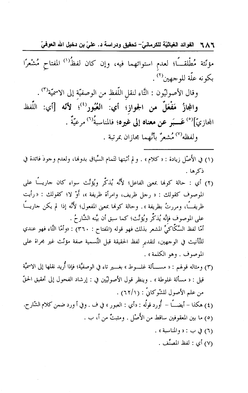 (¬3) ومثاله قولهم: "مسألة غلوط" بغير تاء في الوصفيَّة؛ فإذا أُريد نقلها إلى الاسميَّة قيل: "مسألة غلوطة". وينظر قول الأصوليّين في: إرشاد الفحول إلى تحقيق الحق من علم الأصول للشّوكانيّ: (1/ 62).