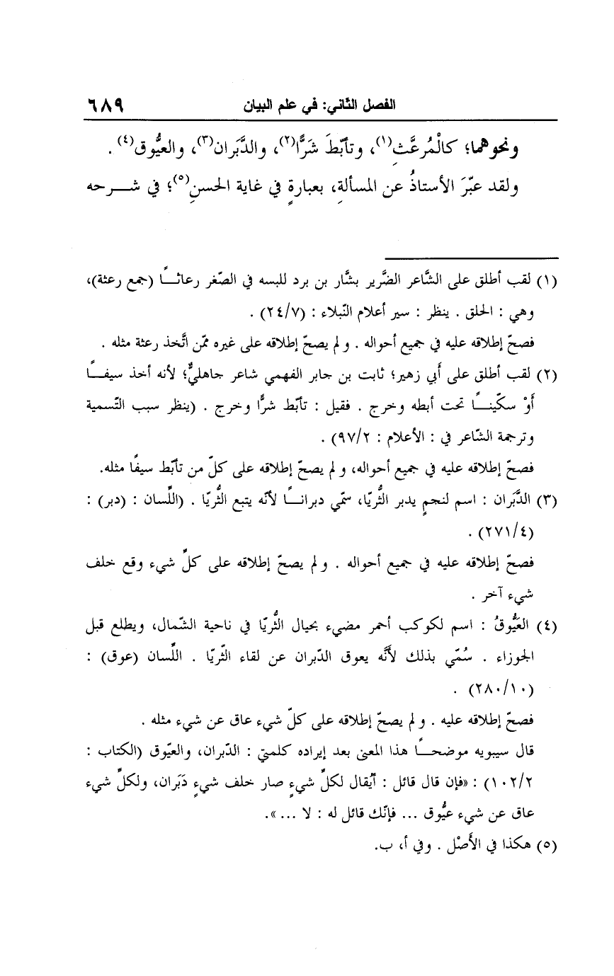 قال سيبويه موضحًا هذا المعنى بعد إيراده كلمتي: الدّبران، والعيوق (الكتاب: 2/ 102): "فإن قال قائل: أيقال لكلِّ شيء صار خلف شيءٍ دَبَران، ولكلِّ شيء عاق عن شيء عيُّوق ... فإنك قائل له: لا ... ".