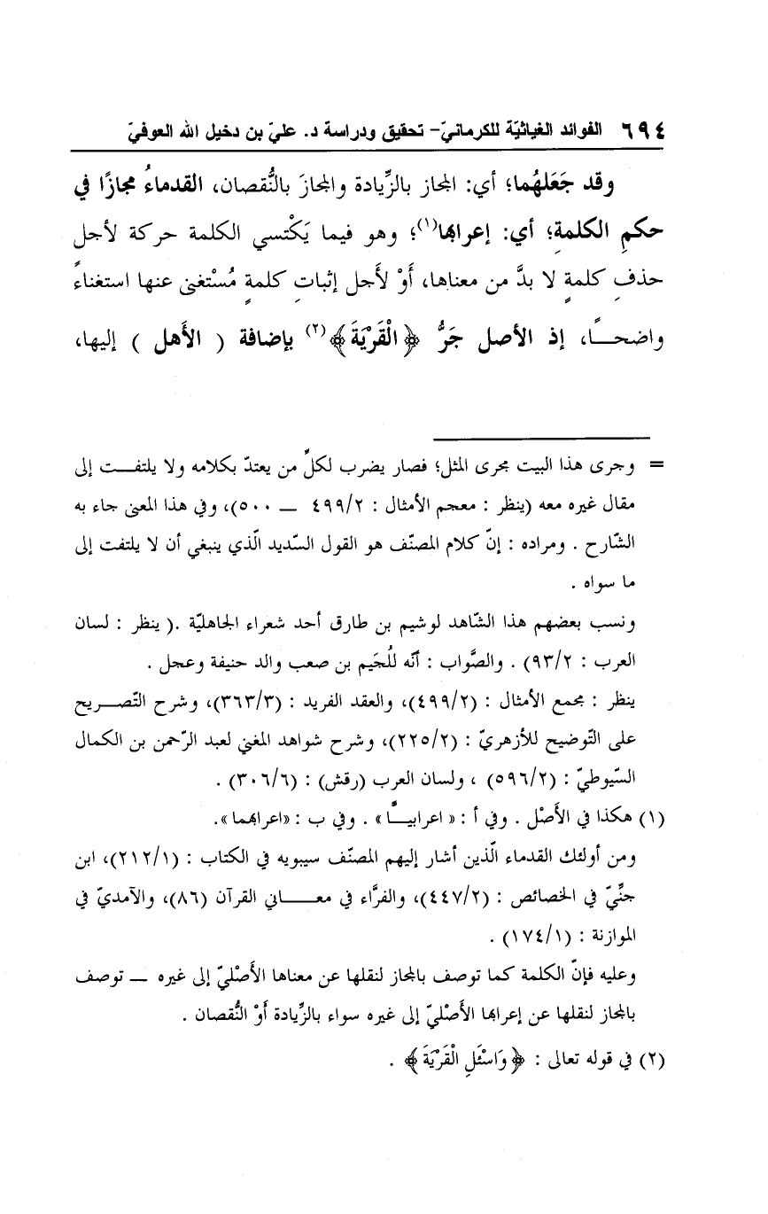 وقد جَعَلهُما؛ أي: المجاز بالزِّيادة والمجازَ بالنُّقصان، القدماءُ مجازًا في حكمِ الكلمةِ؛ أي: إعرابها (¬1)؛ وهو فيما يَكْتسي الكلمة حركة لأجل حذفِ كلمةٍ لا بدَّ من معناها، أَوْ لأَجل إثباتِ كلمةٍ مُسْتغنى عنها استغناءً واضحًا، إذ الأصل جَرُّ {الْقَريةَ} (¬2) بإضافة (الأَهل) إليها،