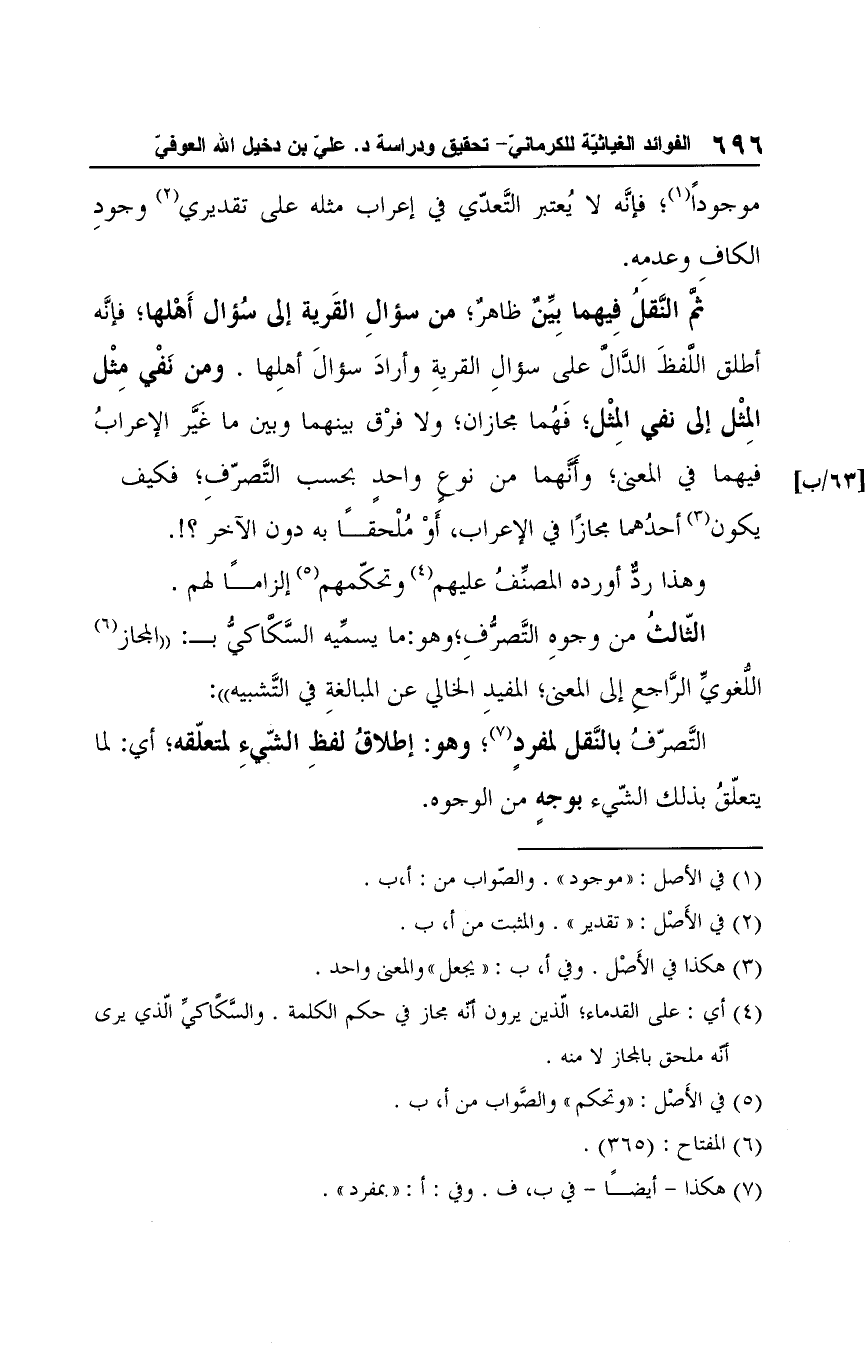 ثم النقلُ فِيهما بِيِّنٌ ظاهرٌ، من سؤالِ القَرية إلى سُؤال أَهْلها، فإنَّه أطلق اللَّفظَ الدَّالَّ على سؤالِ القريةِ وأرادَ سؤال أهلِها. ومن نَفْي مِثْل المِثْل إلى نفي المِثْل؛ فَهُما مجازان؛ ولا فرْق بينهما وبين ما غَيَّر الإعرابُ فيهما في المعنى، وأنَّهما من نوع واحدٍ بحسب التَّصرّفِ، فكيف يكون (¬3) أحدُهما مجازًا في الإعراب، أَوْ مُلْحقًا به دون الآخر؟!.