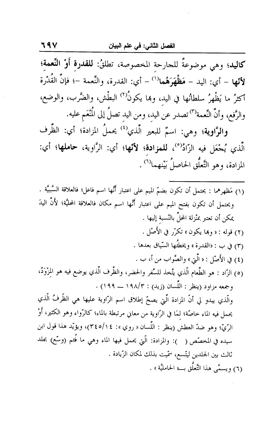 (¬1) مَظهرهما: يحتمل أن تكون بضمِّ الميم على اعتبار أنَّها اسم فاعل؛ فالعلاقة السَّببيَّة. ويحتمل أن تكون بفتح الميم على اعتبار أنَّها اسم مكان فالعلاقة المحليَّة؛ لأَن اليدَ يمكن أن تعتبر بمنْزلة المحل بالنّسبة إليها.