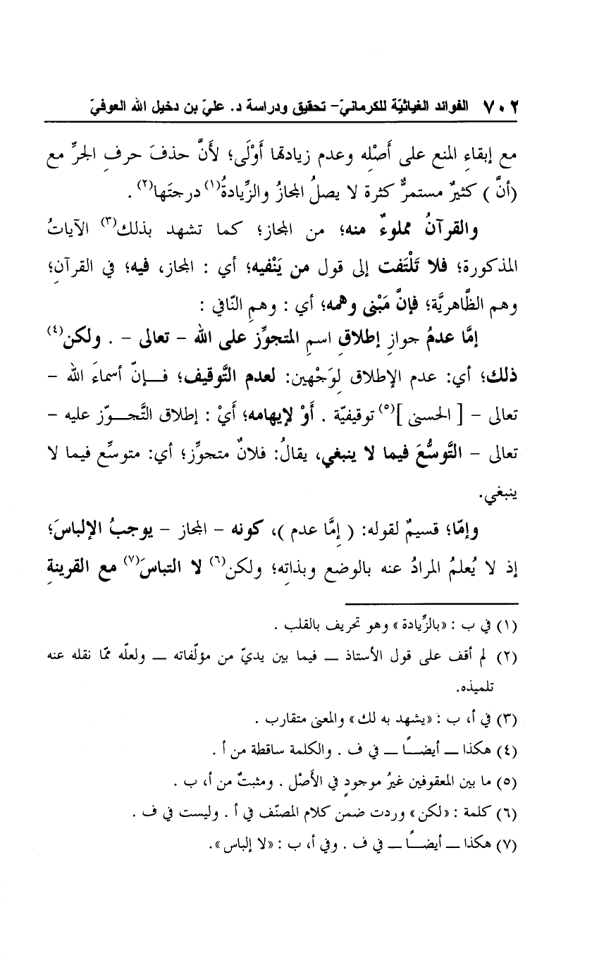 إمَّا عدمُ جوازِ إطلاقِ اسمِ المتجوِّز على الله -تعالى-. ولكن (¬4) ذلك، أي: عدم الإطلاق لِوَجْهين: لعدم التوقف، فإنّ أسماءَ الله -تعالى-[الحسنى] (¬5) توقيفيّة. أَوْ لإيهامه، أَيْ: إطلاق التَّجوّز عليه -تعالى- التَّوسُّعَ فيما لا ينبغي، يقالُ: فلانٌ متجوِّز، أي: متوسِّع فيما لا ينبغي.
