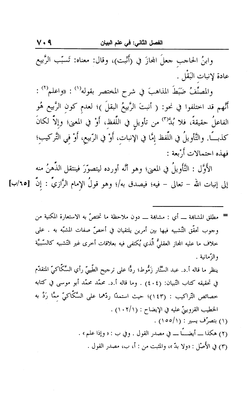 ينظر ما قاله أ. د. عبد الستَّار زَمُّوط، ردًّا على ترجيح الطّيبيّ رأي السَّكاكي المتقدّم في تحقيقه كتاب التّبيان: (404). وما قاله أ. د. محمد محمد أبو موسى في كتابه خصائص التّراكيب: (143)، حيث استمدّا ردّهما على السَّكاكيّ مِمَّا رَدَّ به الخطيب القزويني عليه في الإيضاح: (1/ 102).