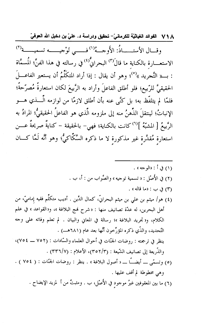 (¬4) هو ميثم بن علي بن ميثم البحراني، كمال الدِّين. أديب متكلم فقيه إِماميّ، من أهل البحرين، له عدّة تصانيف منها: "شرح نهج البلاغة"، و"القواعد" في علم الكلام، و"تجريد البلاغة"؛ رسالة في المعاني والبيان. لم تعلم وفاته على وجه التّحديد، والذّي ذكره المؤرِّخون أنها بعد عام (681 هـ).