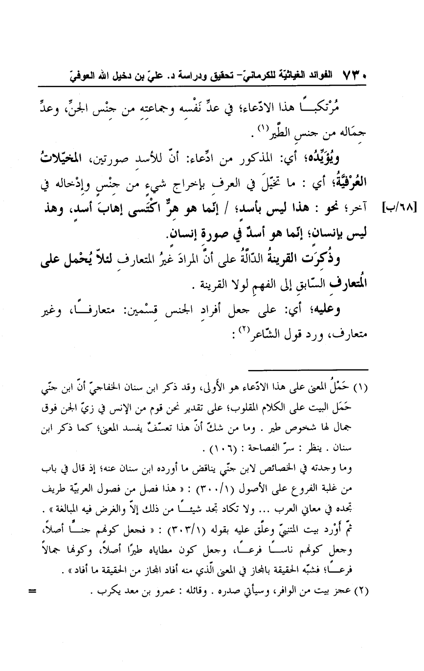(¬1) حَملُ المعنى على هذا الادّعاء هو الأَولى، وقد ذكر ابن سنان الخفاجيّ أنّ ابن جنّي حَمَل البيت على الكلام المقلوب؛ على تقدير نحن قوم من الإنس في زيّ الجن فوق جمال لها شخوص طير. وما من شكّ اُنّ هذا تعسّف يفسد المعنى؛ كما ذكر ابن سنان. ينظر: سرّ الفصاحة: (106).