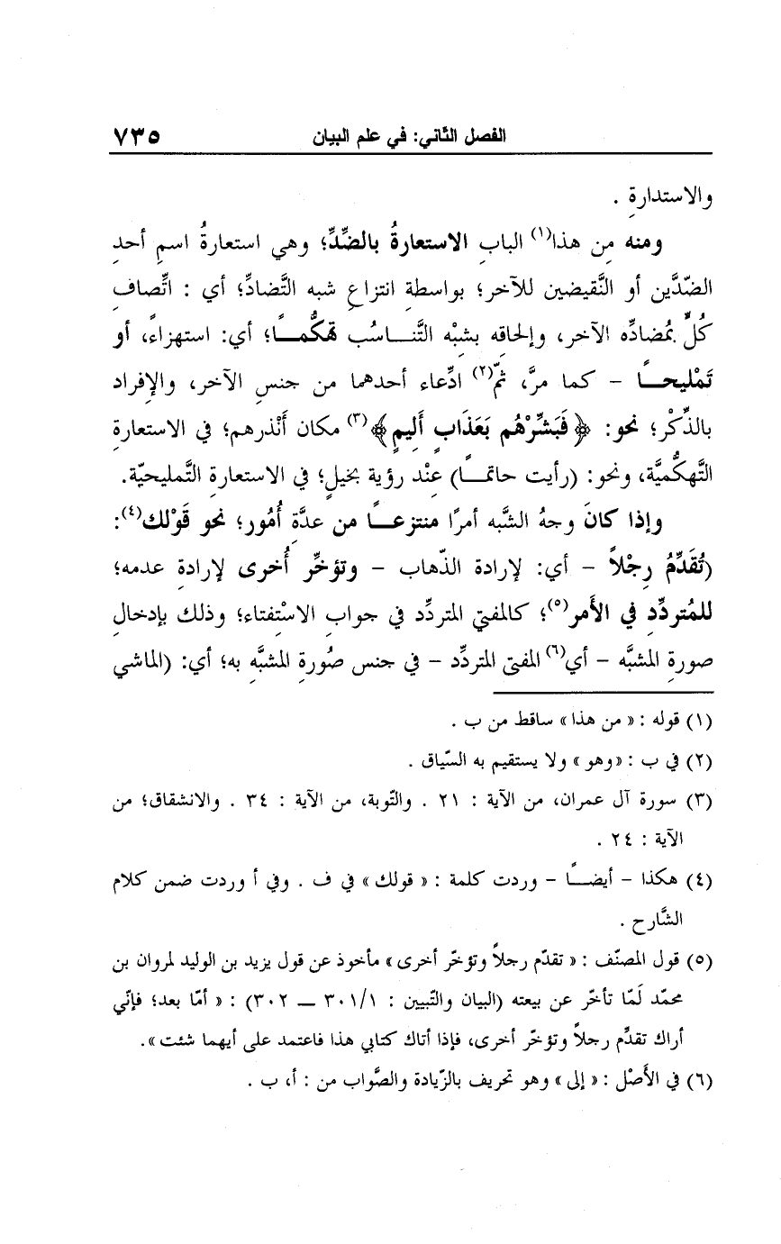 (¬5) قول المصنف: "تقدّم رجلًا وتؤخّر أخرى" مأخوذ عن قول يزيد بن الوليد لمروان بن محمد لَمّا تأخّر عن بيعته (البيان والتبيين: 1/ 301 - 302): "أما بعد؛ فإني أراك تقدِّم رجلًا وتؤخّر أخرى، فإذا أتاك كتابي هذا فاعتمد على أيهما شئت".